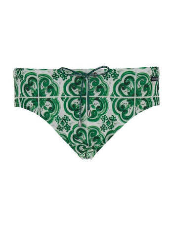 Green And White Swim Briefs With Majolica Print In Tech Spandex Fabric Man