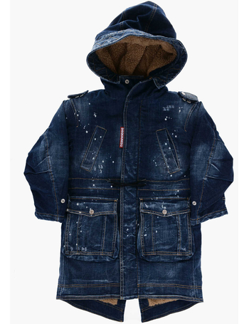 Hooded Stretch Denim Jacket With Faux Fur Lining
