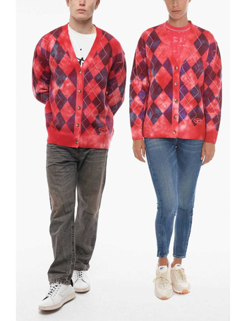 Argyle Motif K-Addice Unisex Cardigan With Acid Wash Effect