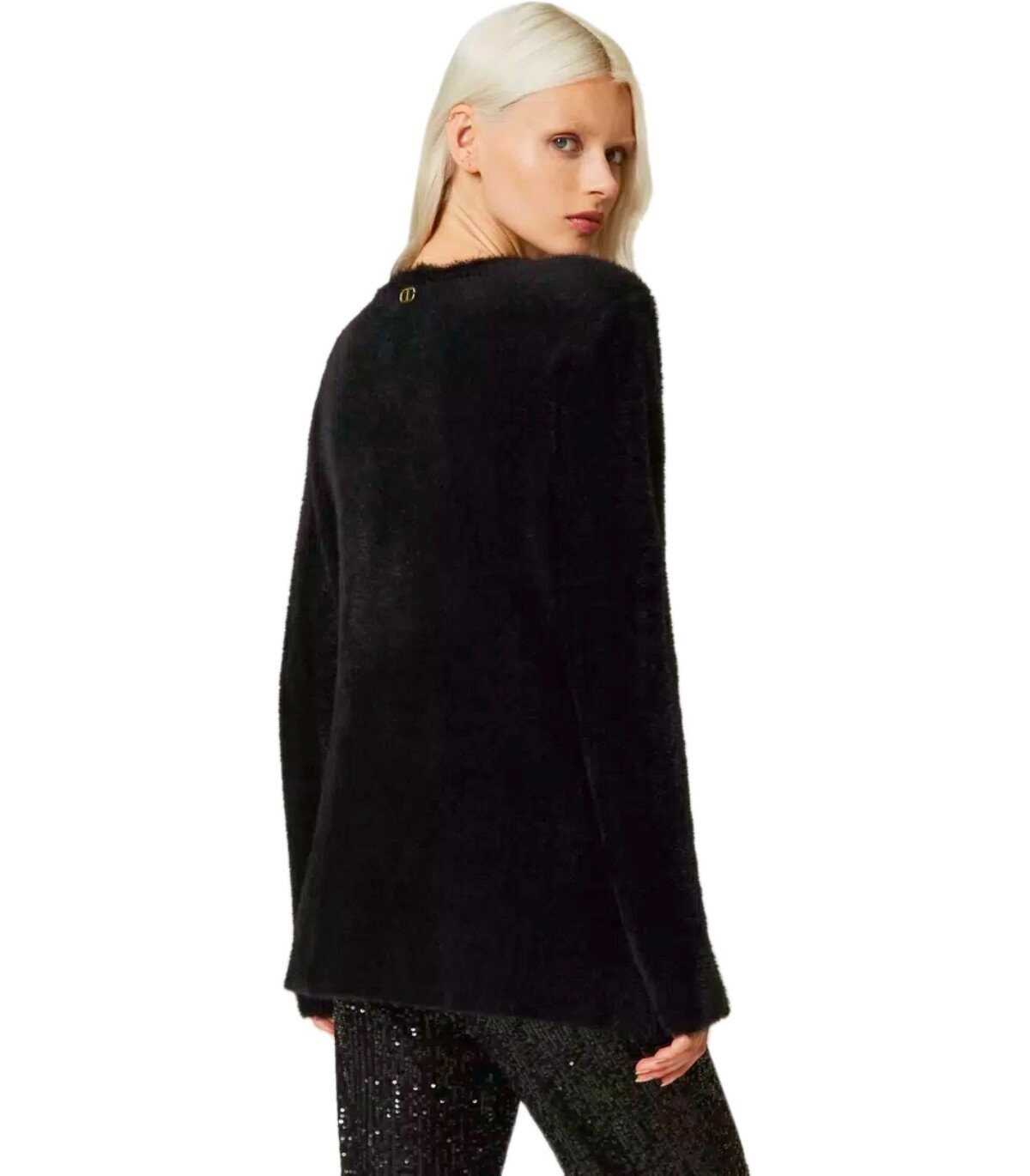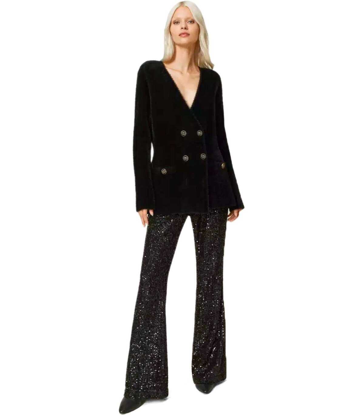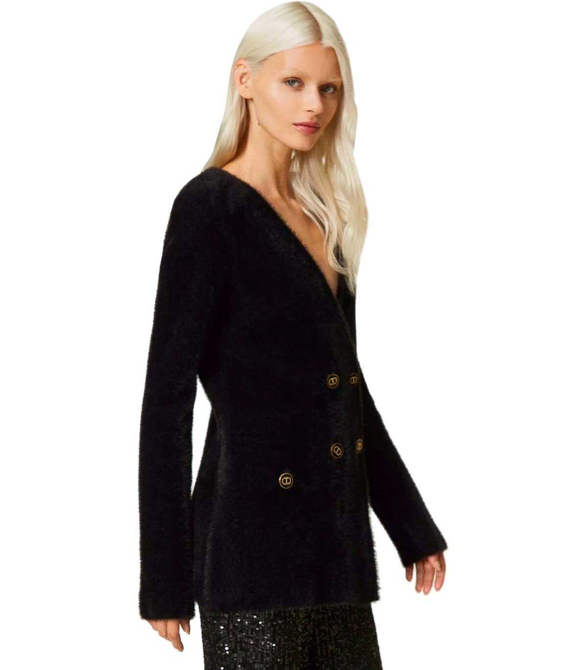 Twinset jacket made of jacquard piquet with a fur effect in shades of black, with lurex details and enameled logo buttons. V-neck and double-breasted closure. Fitted waist.