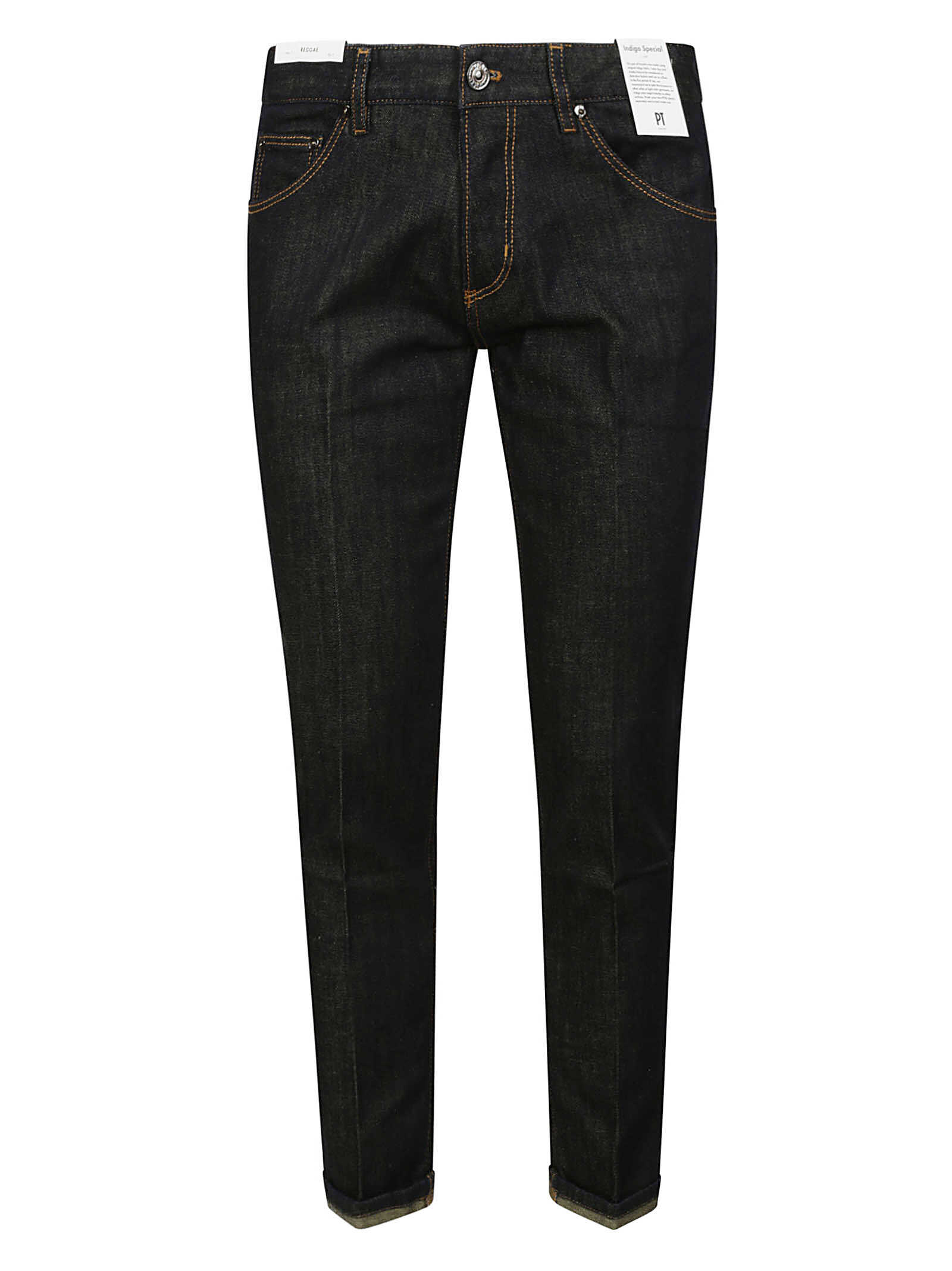 PT Torino jeans in dark stretch denim with aged treatment and contrasting stitching, with a tapered fit. It features 5 pockets, button closure, an unlined waistband, and a double fabric belt.