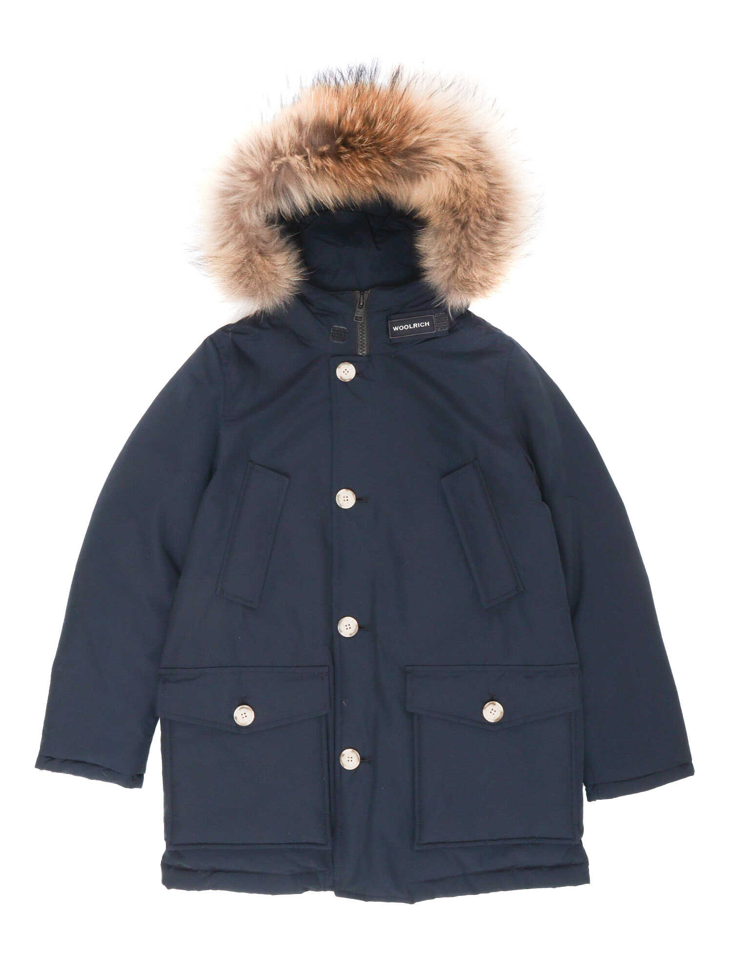 Parka in windproof and rainproof cordura, duck down padding, hood with detachable real raccoon fur, button and zip fastening, flap pockets, ribbed internal cuffs