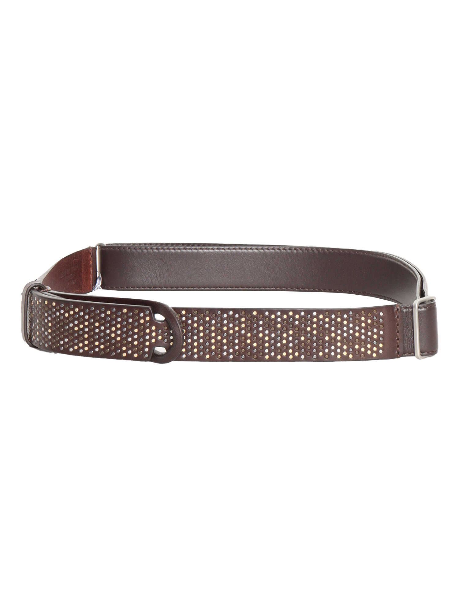 Men's leather belt with all-over colored studs, tone-on-tone brown buckle.