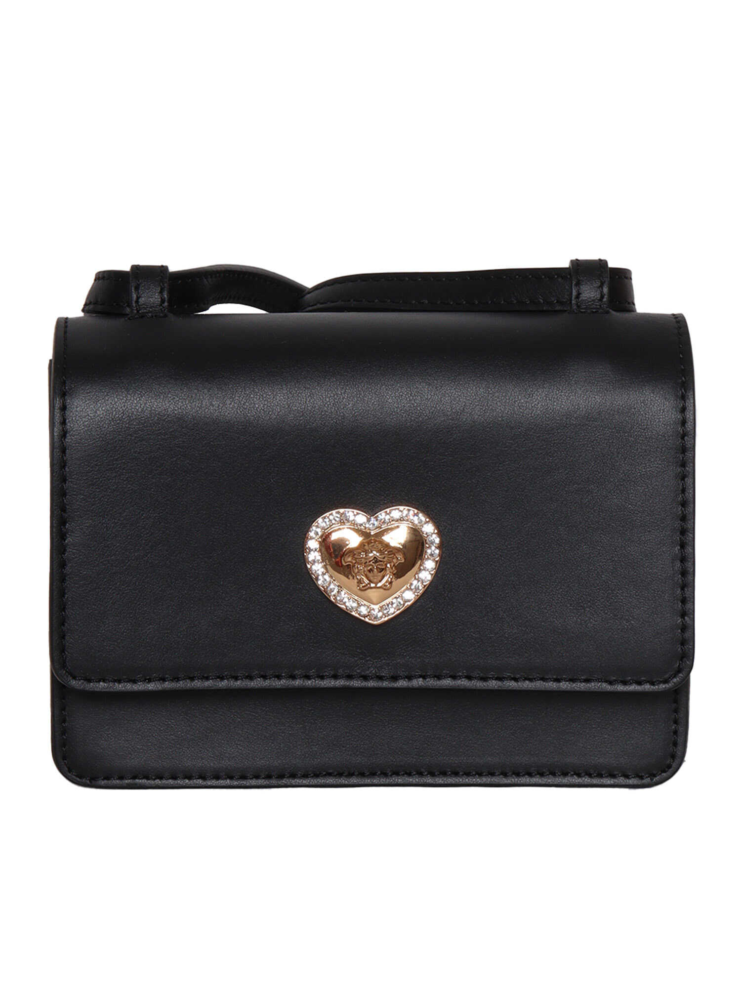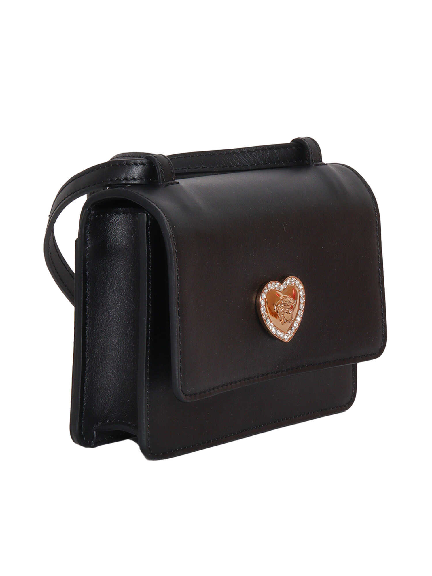Calfskin bag, Medusa plaque detail, internal logo applique, flap with magnetic fastening, shoulder strap, single compartment, lining with printed logo 11 x16 x 4 cm