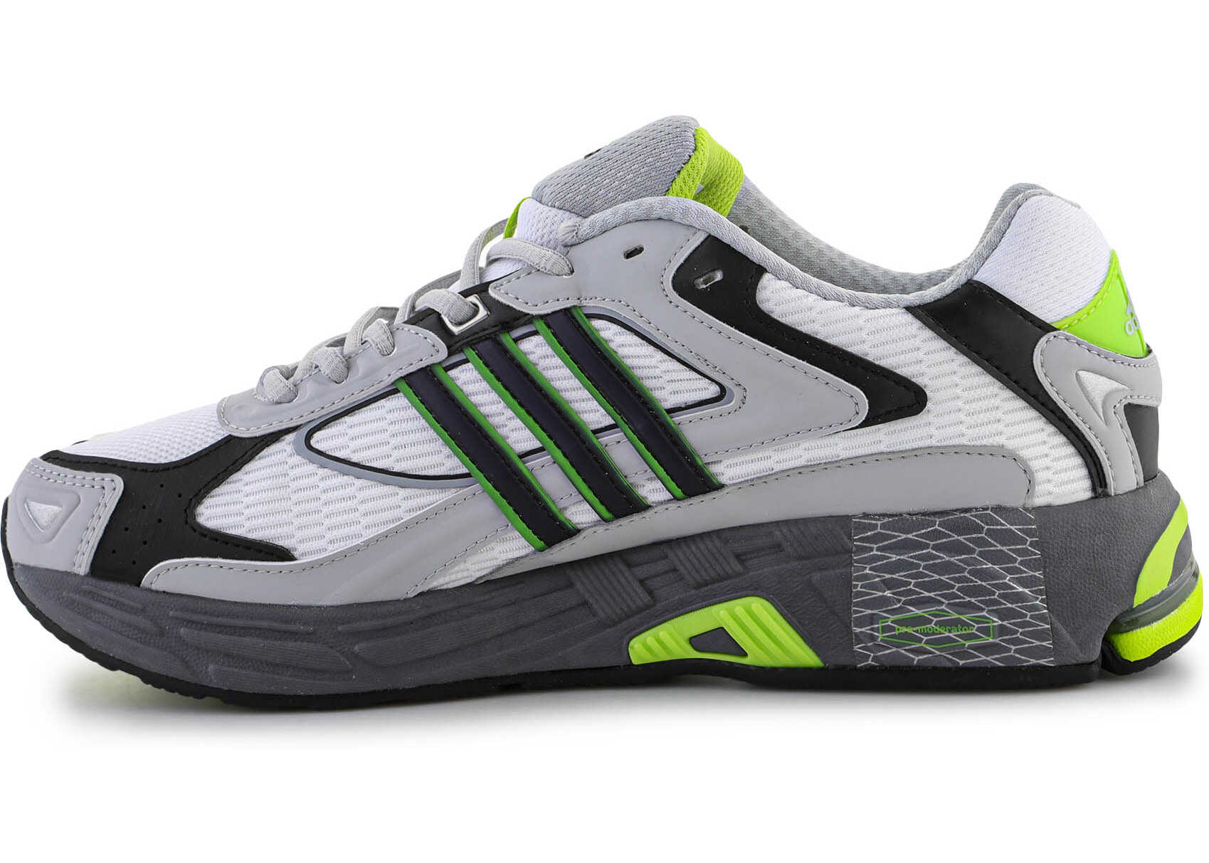 Response CL "Grey Solar Lime" has a neutral look with vibrant accents. The retro-inspired upper of the shoe is made of a layered mix of mesh and synthetic leather, finished in white and gray, highlighted with accents of green. The Response Cushion-inspired upper is supported by hardware derived from Response Control 7, combining Adiprene, Formotion and Promoderator for cushioning. Reinforced Aidwear outsole provides stability and traction.