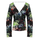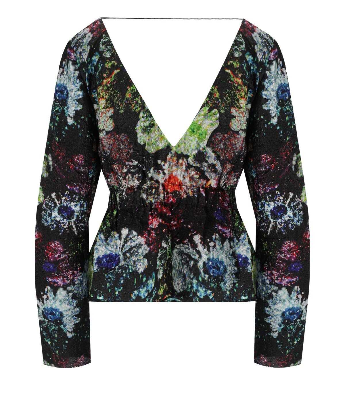 Stine Goya Nathalie peplum top, made in black recycled polyester blend with a multicolored floral pattern. It features a wide V-neckline and an elastic detail at the waist. Depending on the fabric cut, the pattern may vary slightly from piece to piece.