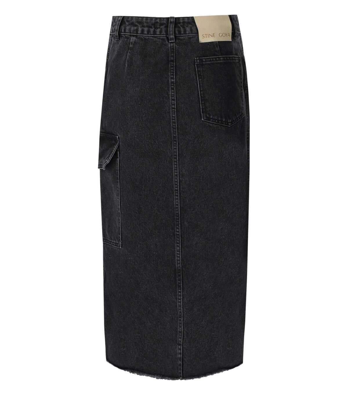 Peter skirt by Stine Goya made from anthracite gray cotton denim, equipped with a cargo pocket on the side and fringed bottom. Front slit, zip and button closure.