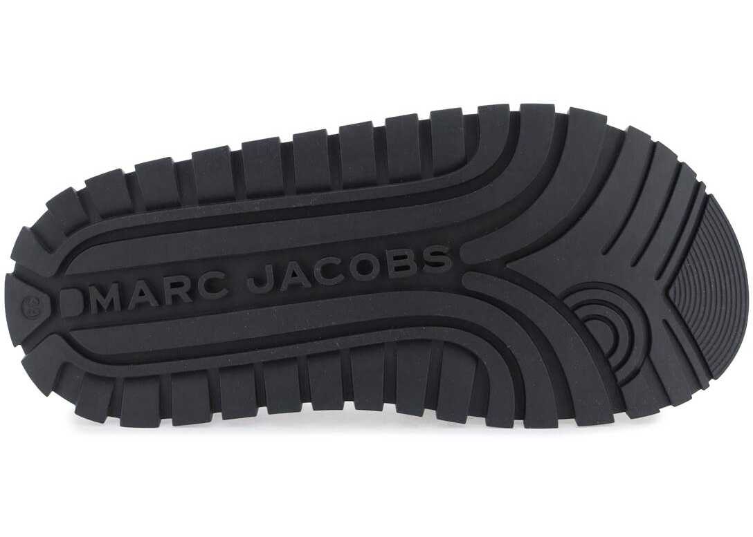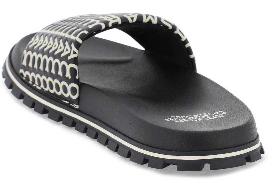 Marc Jacobs slides featuring leather band characterized by embossed and contrasting monogram pattern. Anatomical rubber footbed, rubber logoed sole.
