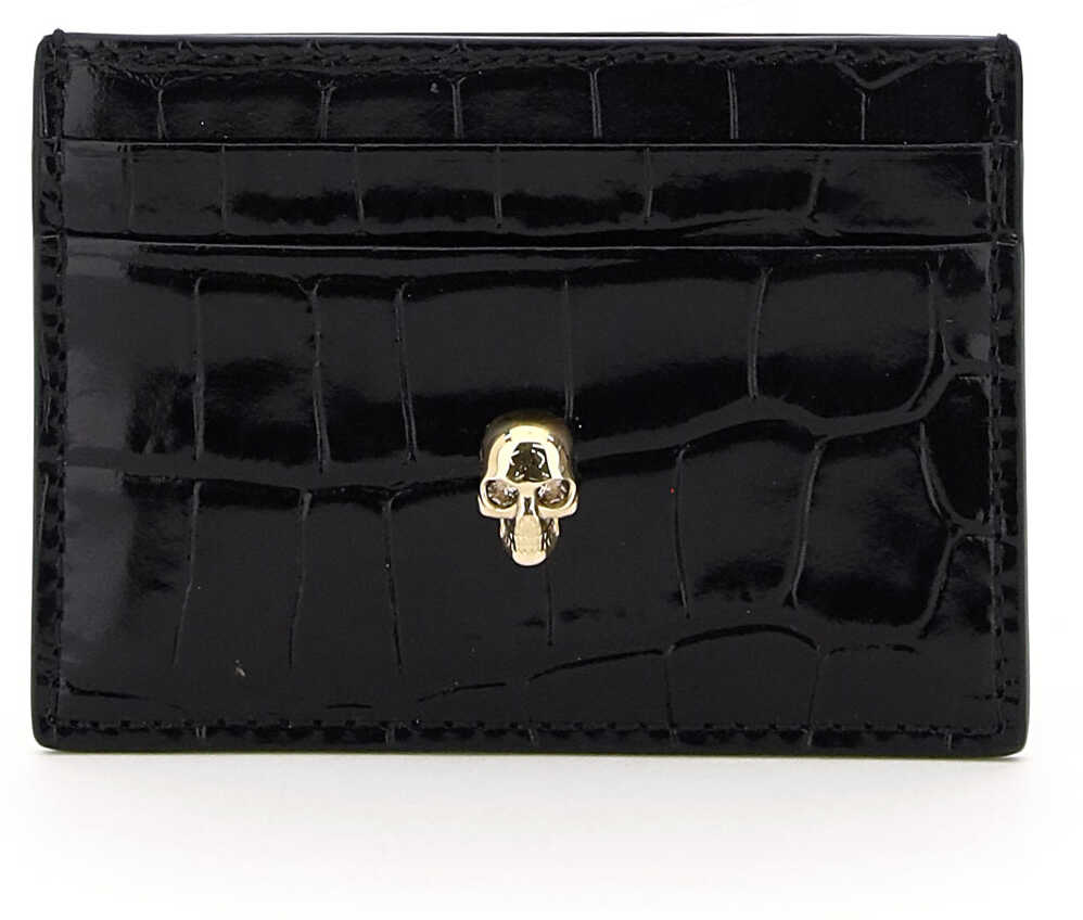 Alexander McQueen card holder in crocodile-embossed leather, enriched by the iconic Skull in gold-tone metal with embedded crystals applied on front. Four credit card slots, central flat pocket with leather lining, gold-tone logo print on the back.
