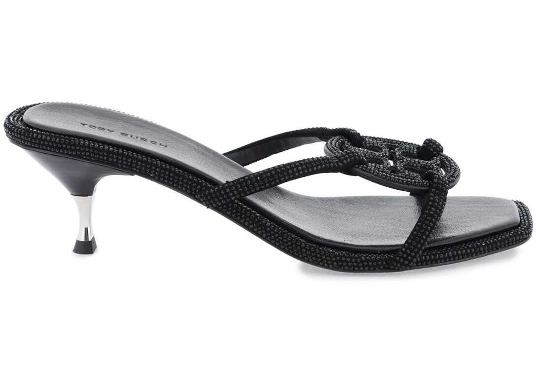 Geo Bombé sandals by Tory Burch made of leather and decorated with crystal pavé on suede details and bombé double T. Padded leather insole, lacquered ABS plastic heel and leather sole.
