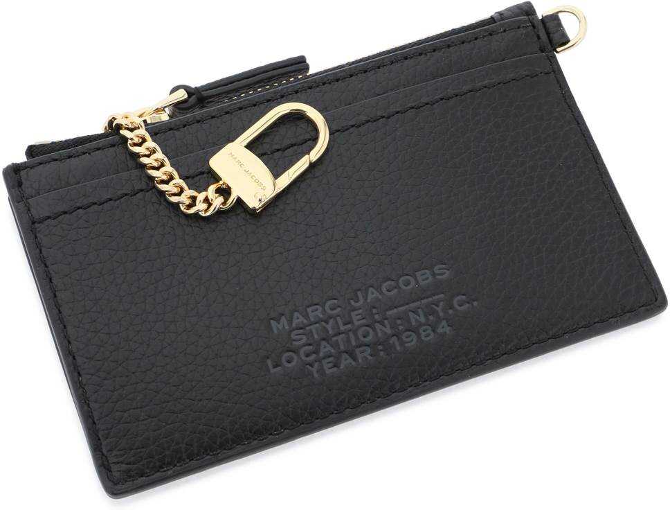 Wrist wallet by Marc Jacobs made of grained leather with inner key ring. Twill lining, zippered pocket, four credit card slots, removable leather handle. Gold-finished metalware.