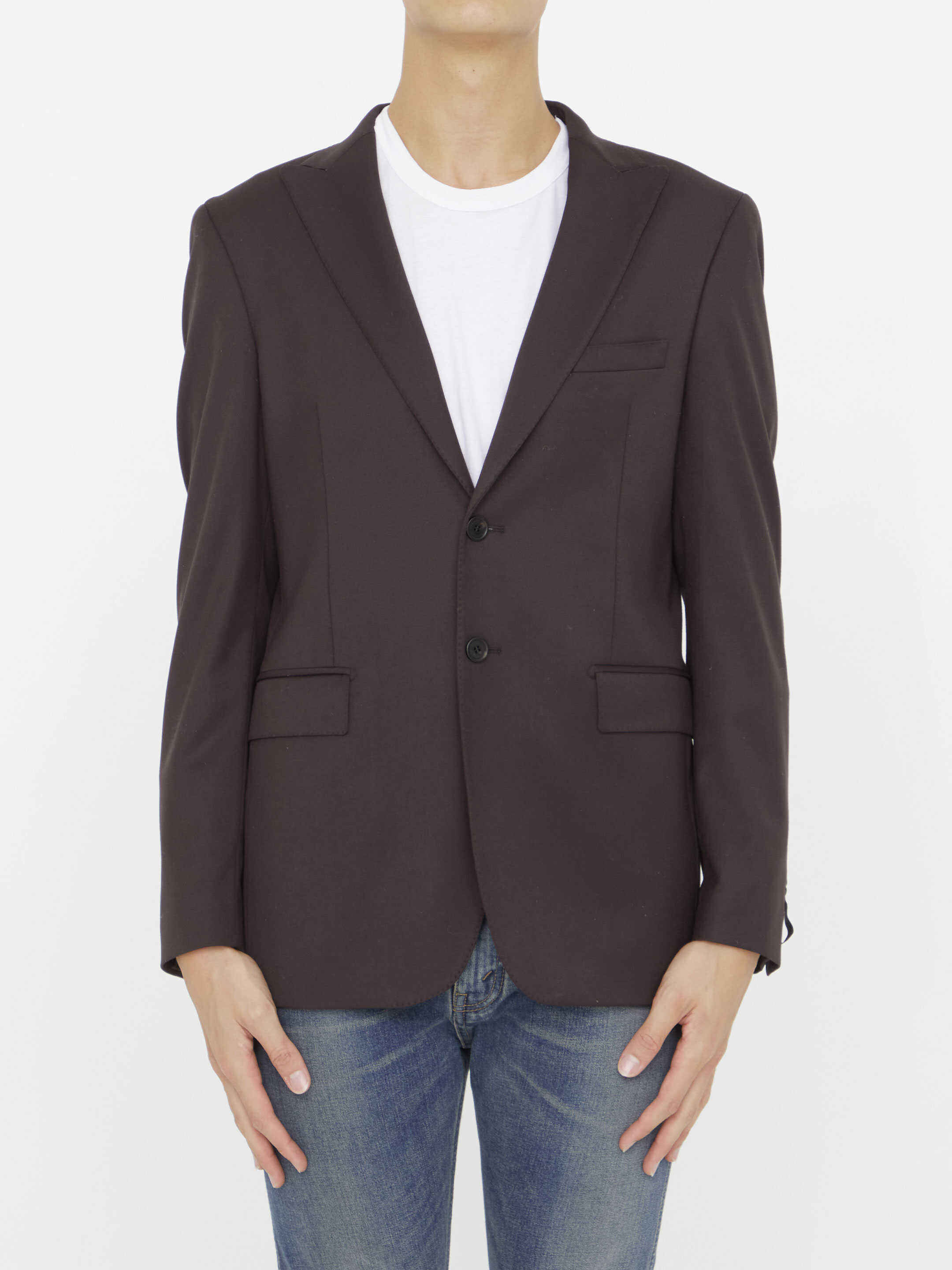 Two-piece suit in brown viscose blend. Jacket with classic lapels, single-breasted closure, two front flap pockets, a welt pocket on chest and buttoned cuffs. Straight-leg pleated trousers, zip, button and hook-and-eye closure, two side welt pockets, two rear welt pockets and belt loops. Regular fit.