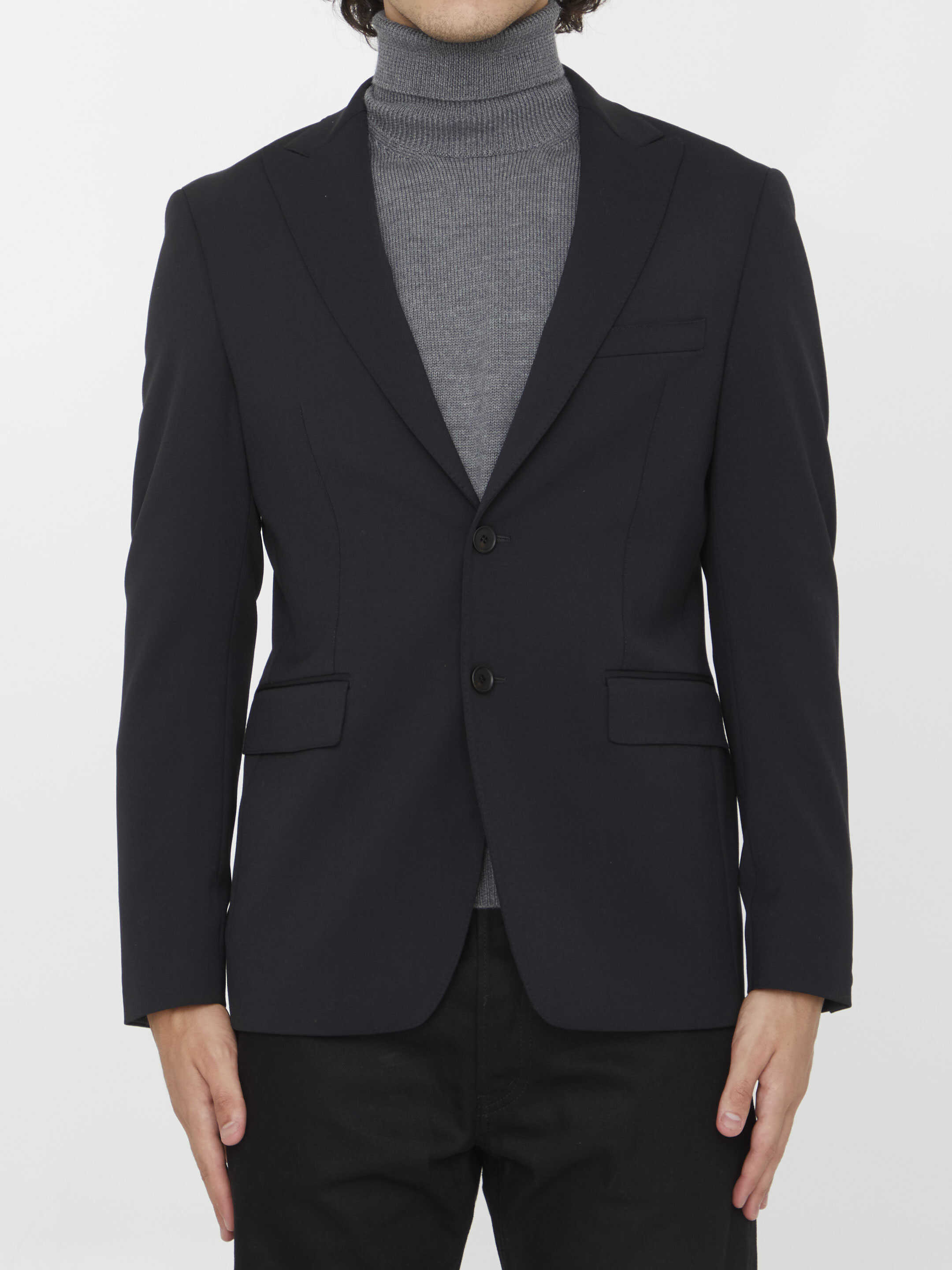 Single-breasted jacket in black virgin wool blend. It features peaked lapels, front button closure, two front flap pockets, a welt pocket on chest and buttoned cuffs. Regular fit.