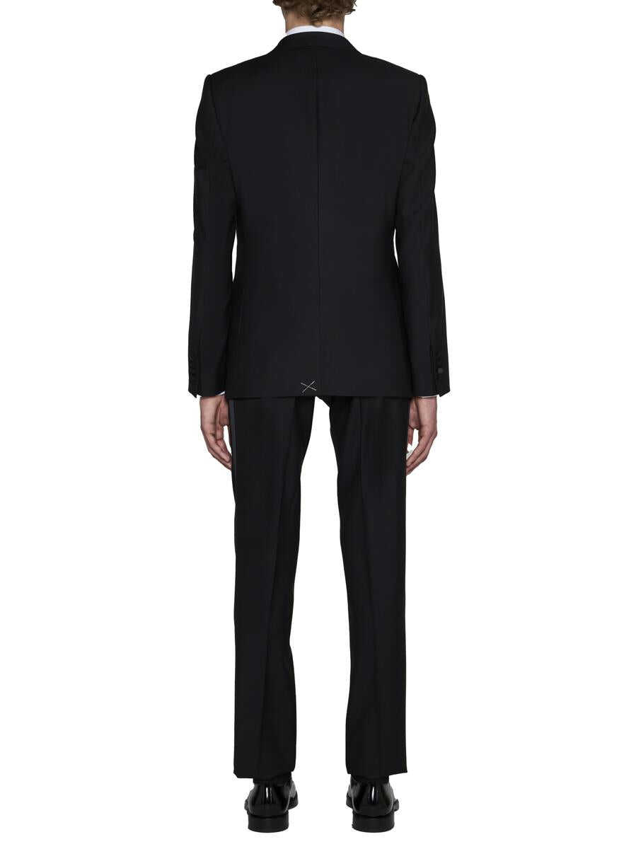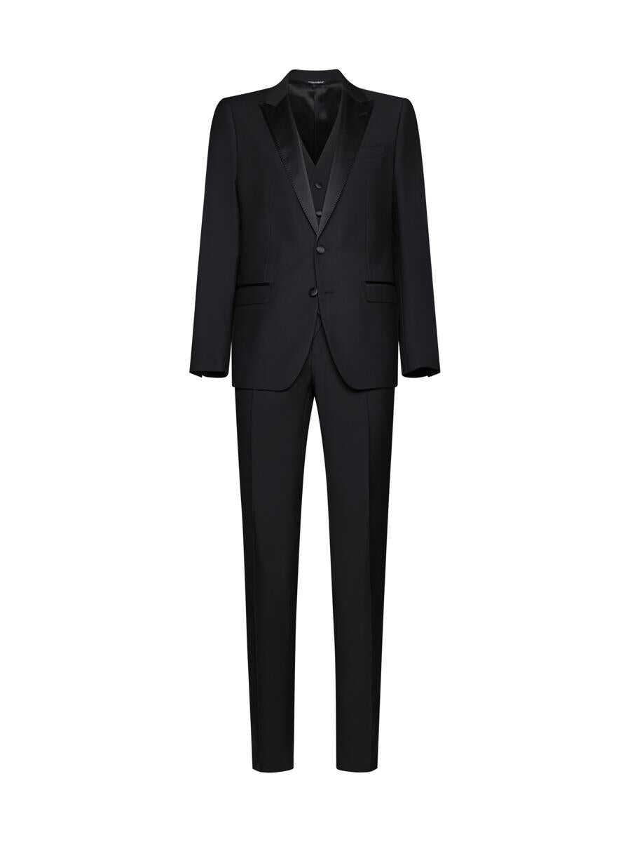 Dolce & Gabbana’s three-piece suit in black virgin wool and silk. Single-breasted blazer featuring satin peak lapels, satin-covered buttons, chest pocket, front flap pockets and center back vent. Vest featuring a V-neck, front buttoning and welt pockets. Straight leg trousers featuring four pocket cut and ironed crease.