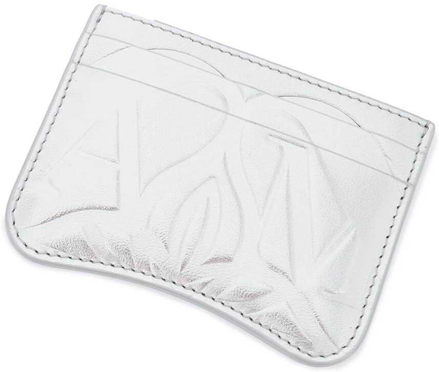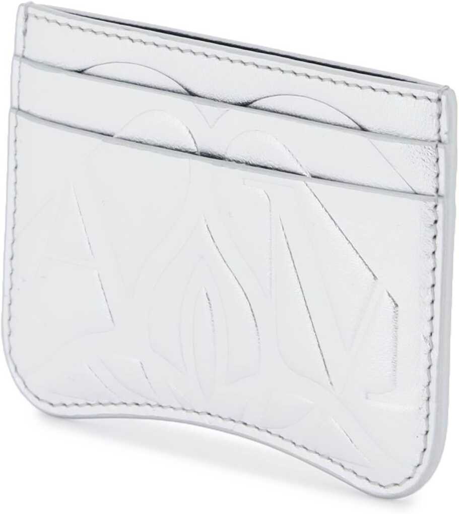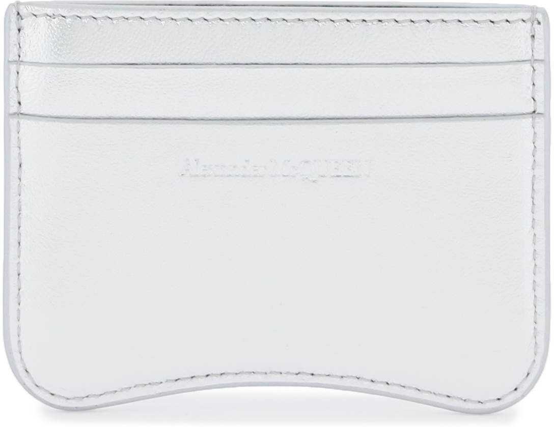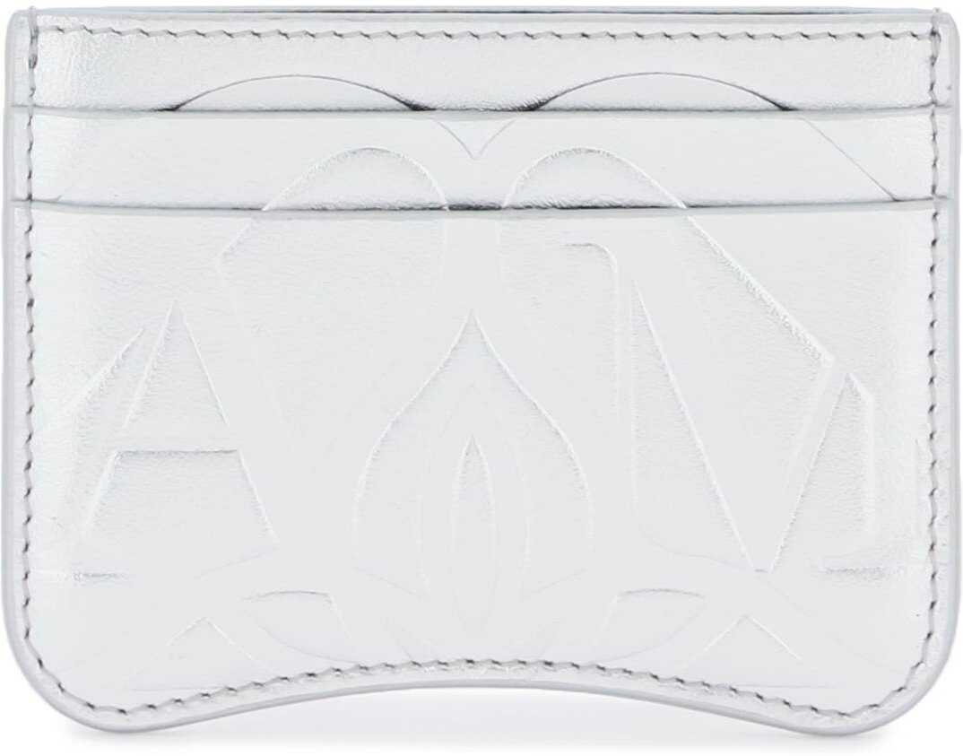 Laminated leather credit card holder by Alexander McQueen with embossed Seal pattern, two slots on each side and a center slot.