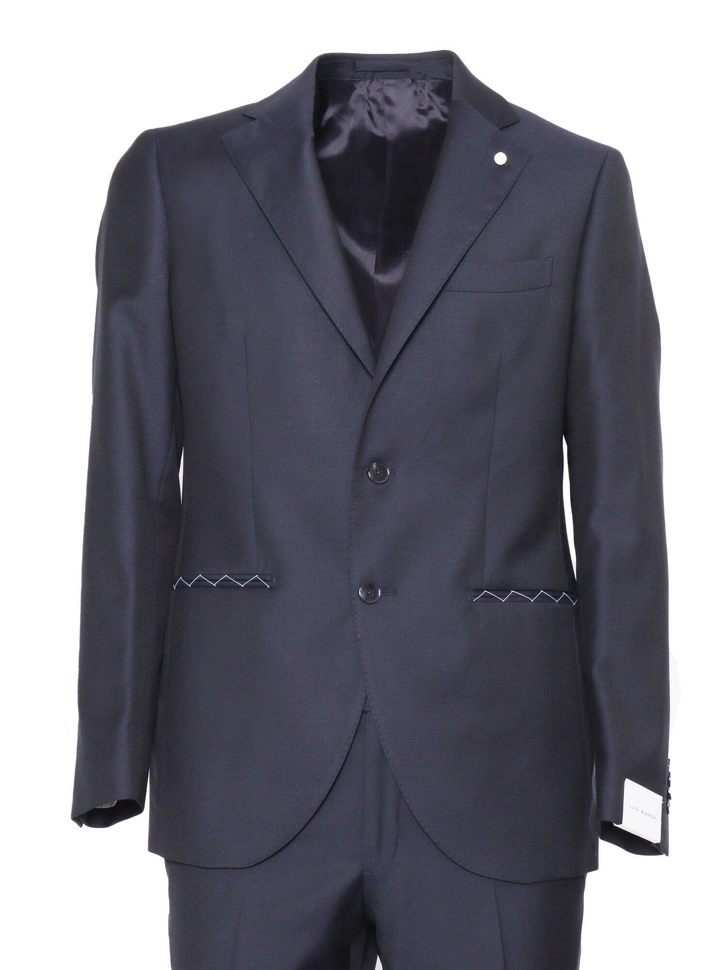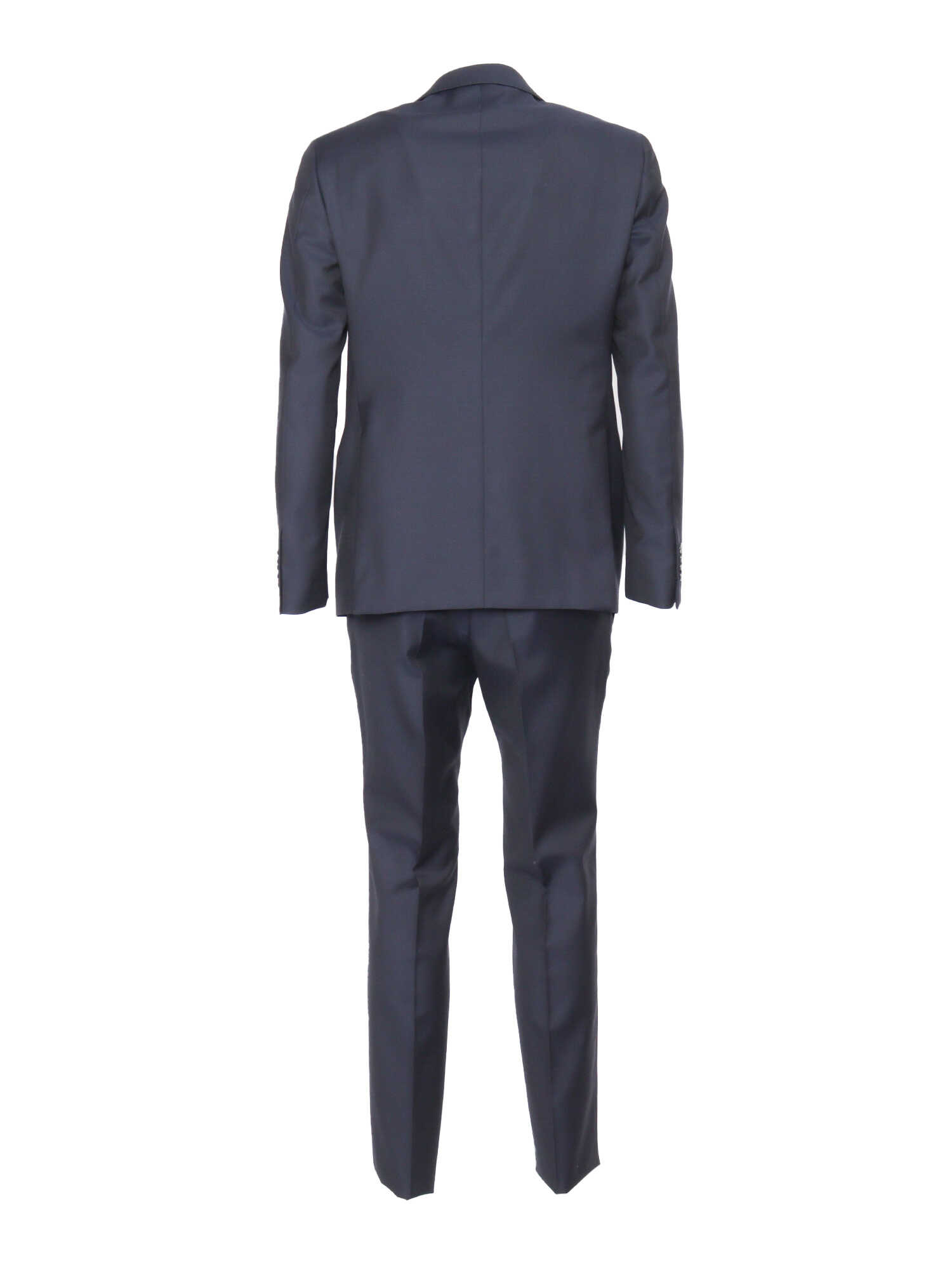 Virgin wool suit, single-breasted jacket, lapel collar with logo pin, welt pockets, breast pocket, tailored pants, button hook and zip fastening, ironed crease, slanted pockets, belt loops