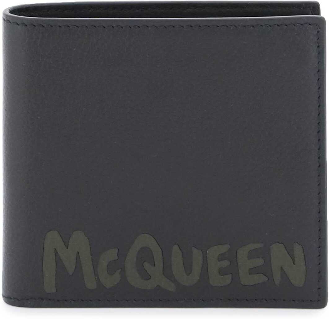 Alexander McQueen bi-fold wallet crafted in grained leather with contrasting embossed Graffiti logo. Leather-lined interior with two flat banknote compartments, eight credit card slots, two slit pockets and silver-tone printed lettering logo.
