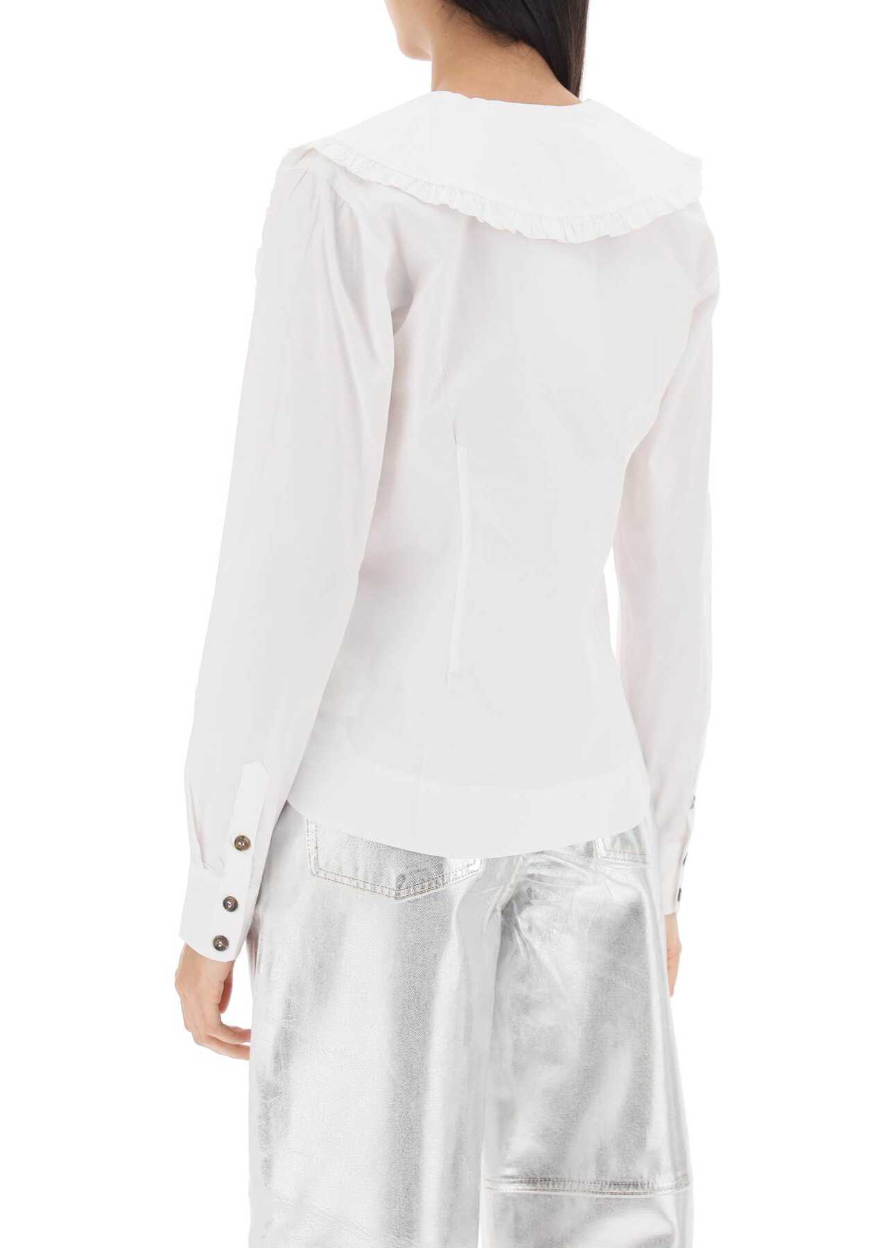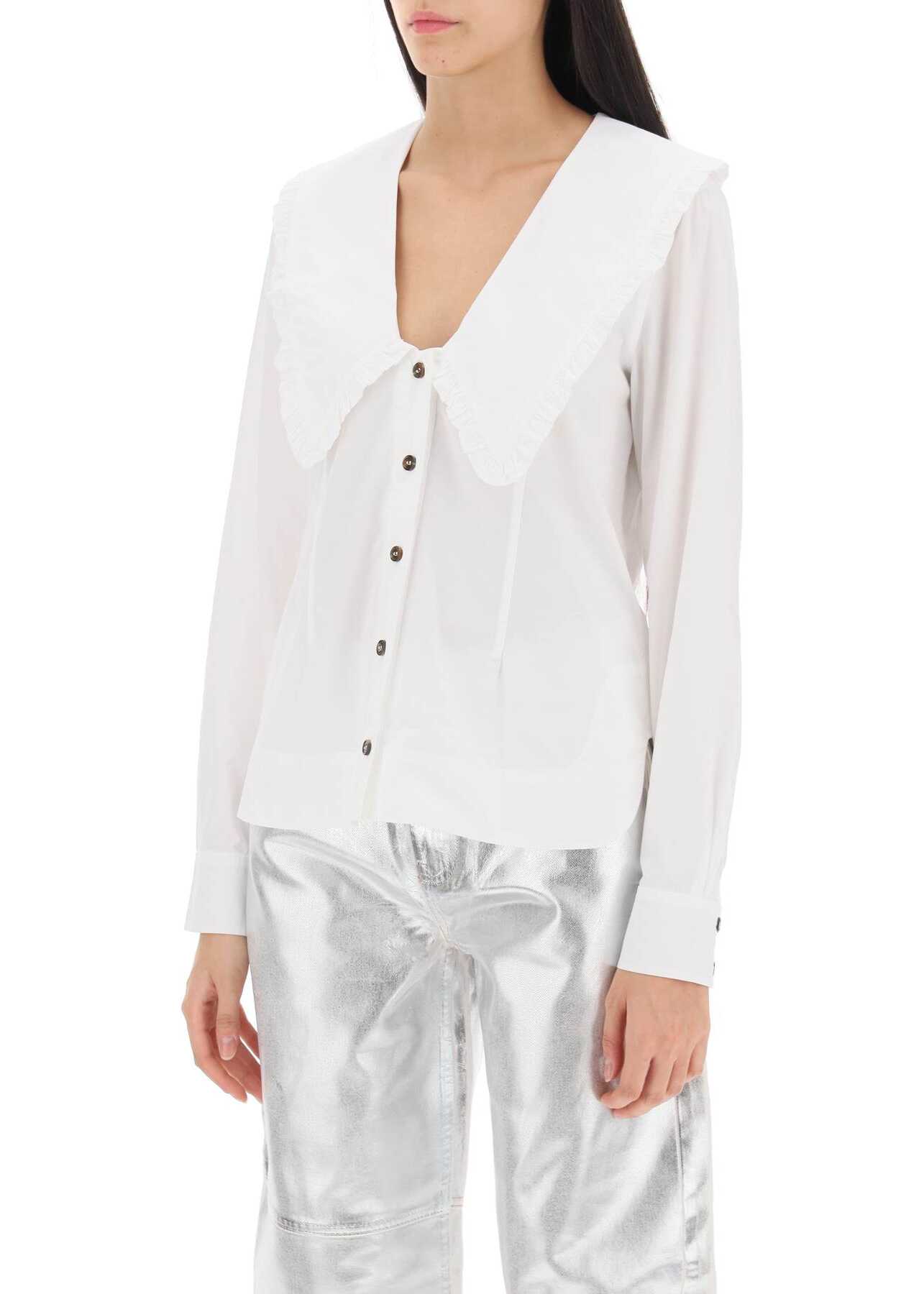 Ganni shirt crafted in organic cotton poplin, characterized by frilled pointed maxi collar. It features V neck, front button closure, buttoned cuffs and rounded hem with side slits. Flared cut. The model is 177 cm tall and wears size EU 34.
