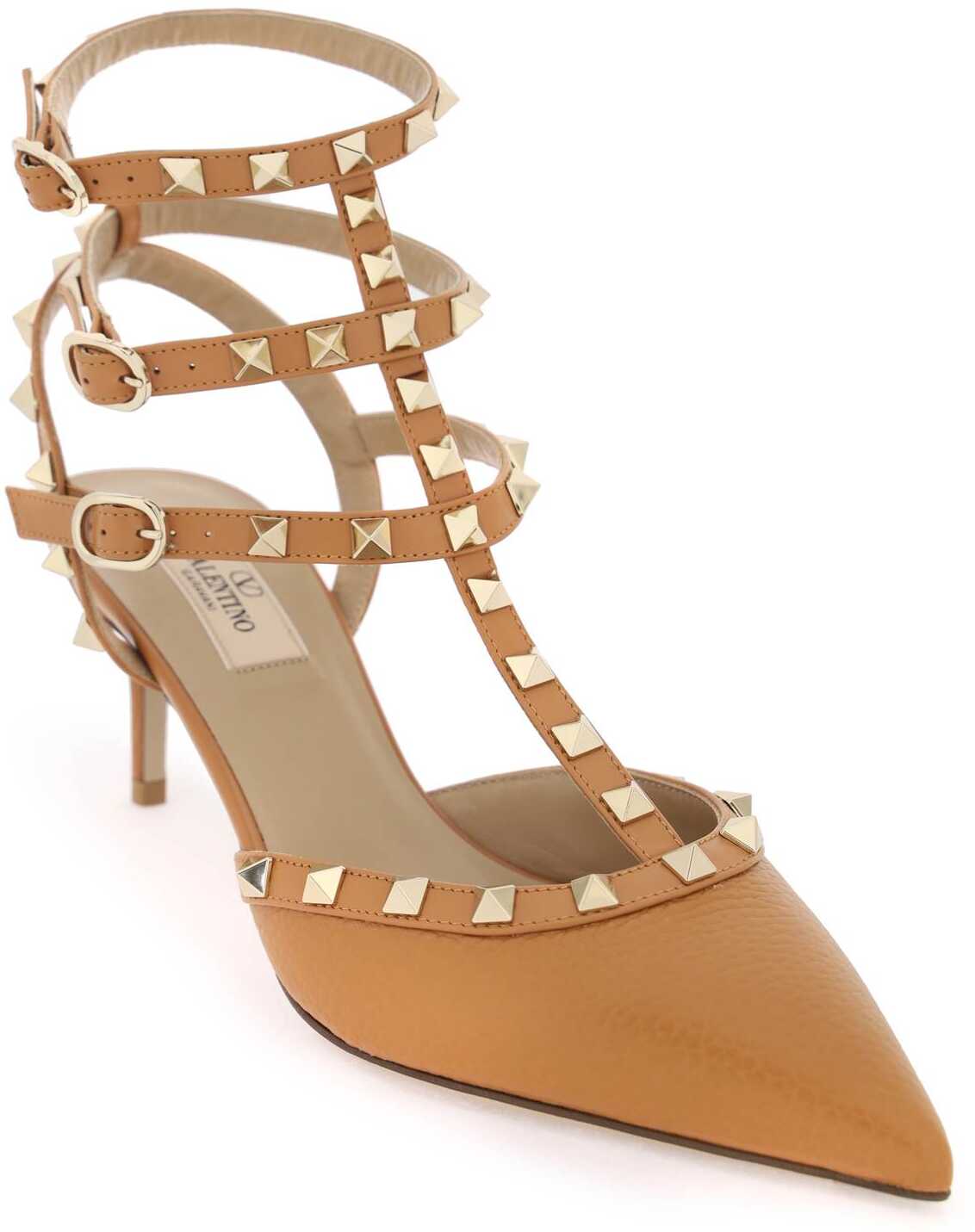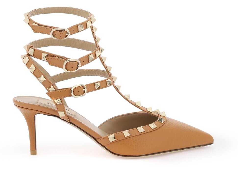 Valentino Garavani grained calf leather Rockstud ankle strap pumps, detailed with leather piping and straps and platinum-finish metal studs. Ankle strap with side buckle, leather insole and outsole.