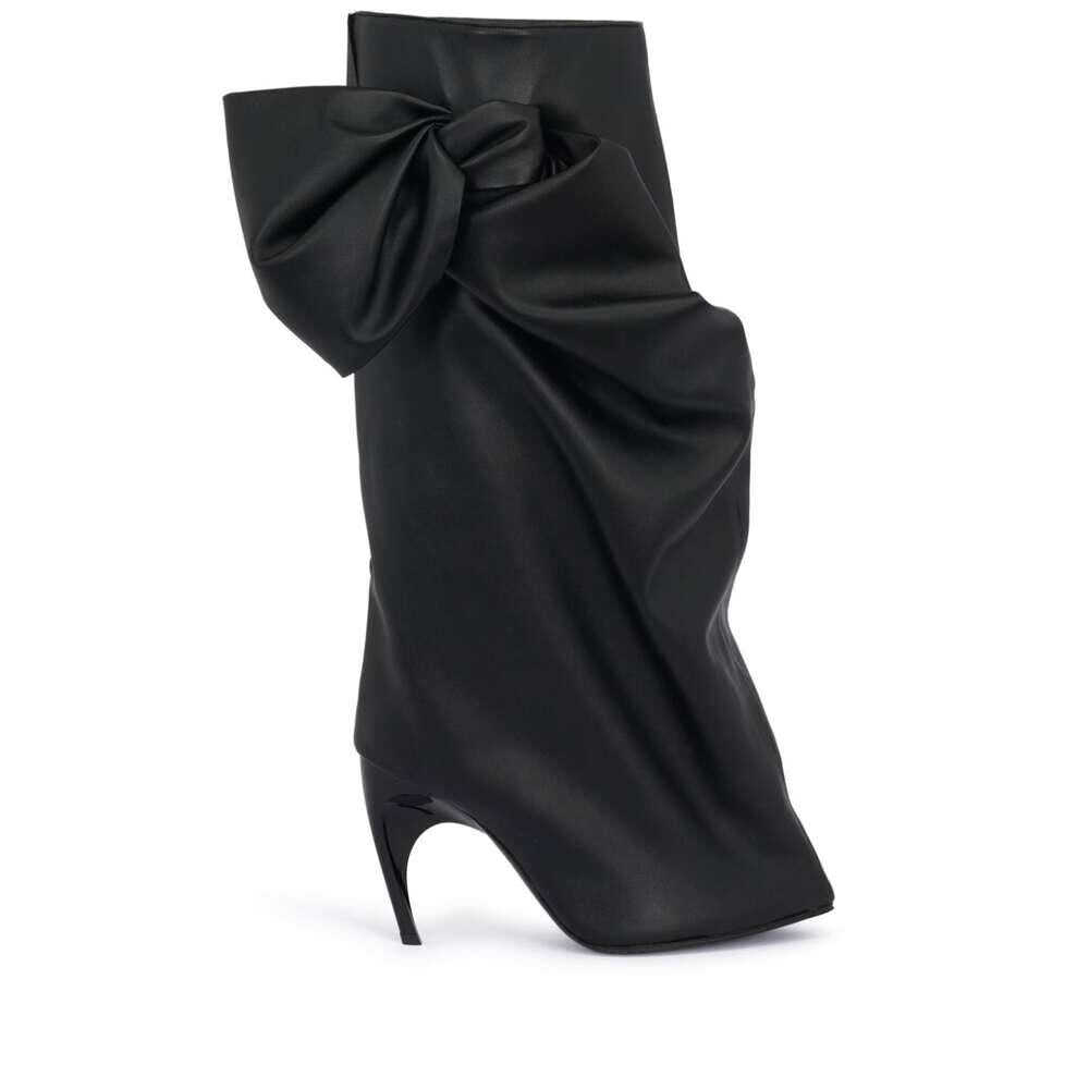 Black leather smooth grain pointed toe oversize bow detail draped detailing branded insole 95mm high stiletto heel rubber sole slip-on style this piece comes complete with a protective dust bag. we've partnered with good on you — an independent agency that rates how brands perform in relation to their impact on the planet, people and animals, with a multi-criteria rating simplified to a five points scale. in order to be awarded our conscious label, larger brands need to score a minimum of four out of five ('good'), while smaller brands must score at least three out of five ('it's a start'). this item comes from a brand rated three out of five ('it's a start') by good on you at the time it was added on farfetch. please note, this is a brand-level rating and does not guarantee that this product is made with conscious materials. learn more about what makes a product conscious on our conscious criteria page
