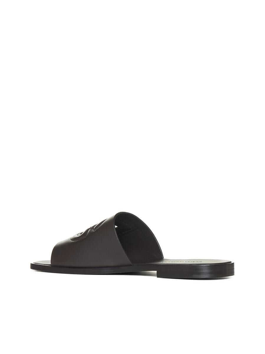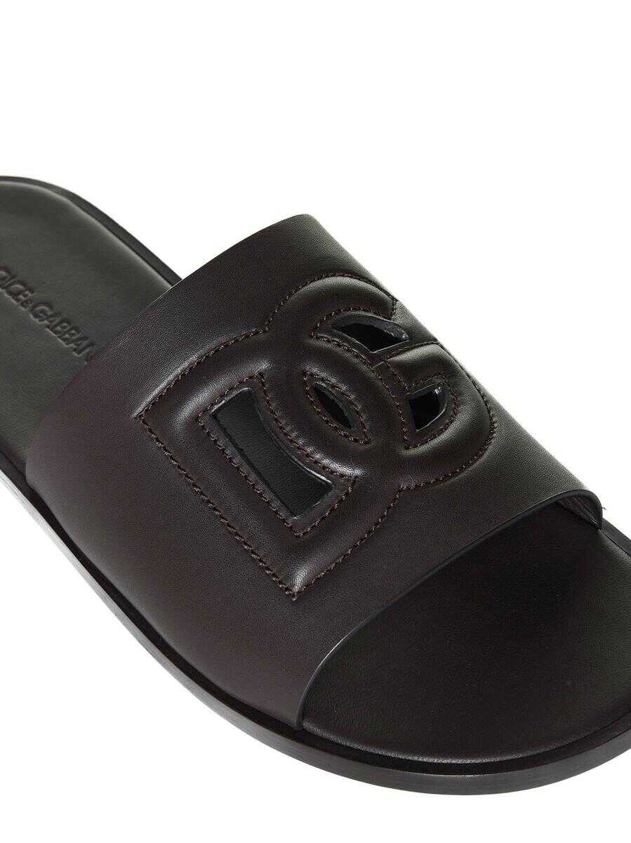 Dolce & Gabbana’s chocolate brown leather slide sandals featuring a rounded toe, wide front strap with DG logo and flat leather sole with low heel.