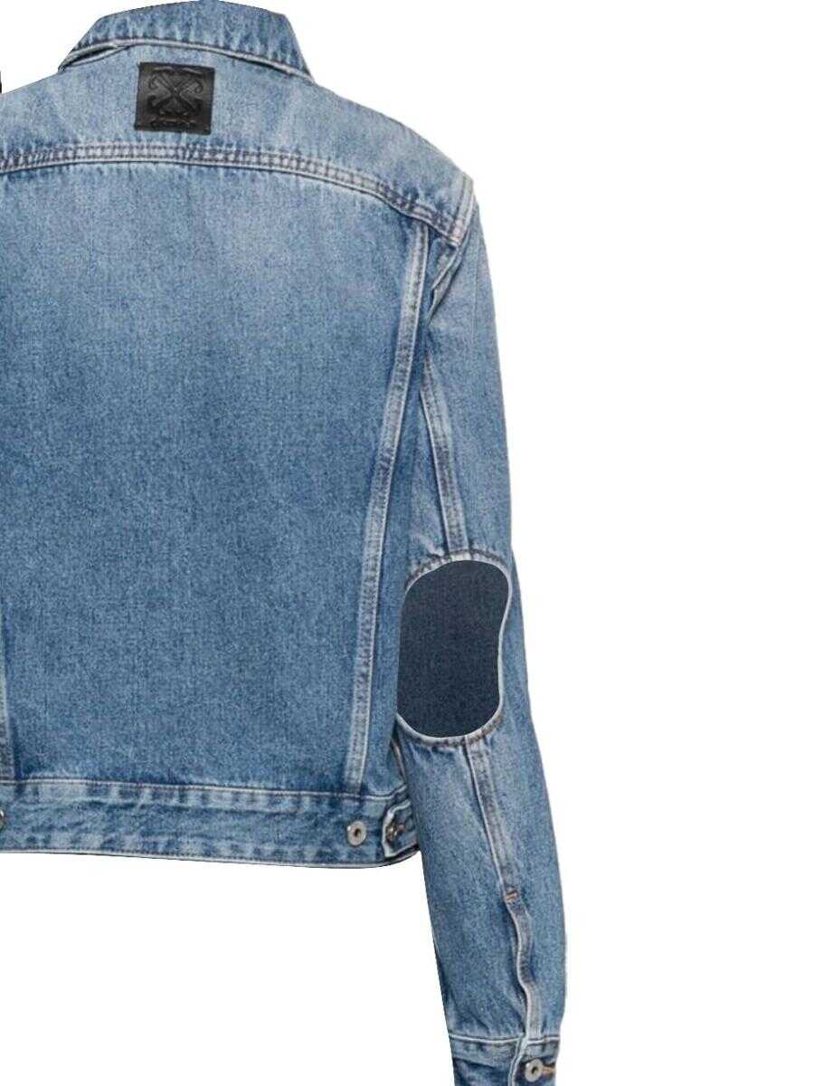 cut-out denim jacket from OFF-WHITE featuring blue, cotton, classic collar, front button fastening, long sleeves, buttoned cuffs, two chest flap pockets, two side slit pockets, cut-out detailing and straight hem