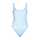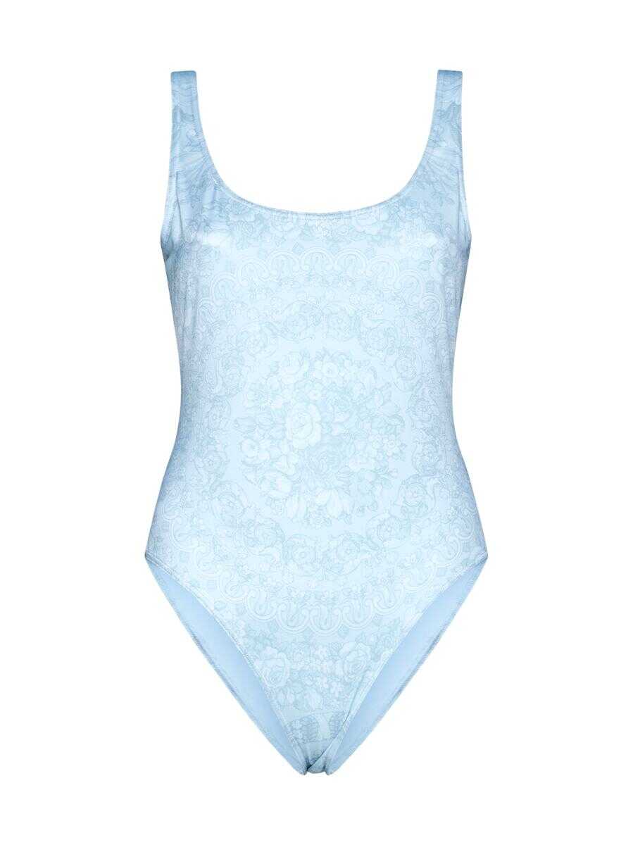 Versace’s swimsuit featuring a Barocco print in shades of pale blue, scoop neck on the front, U-shaped neck on the back and Medusa logo-plaque at centre back.