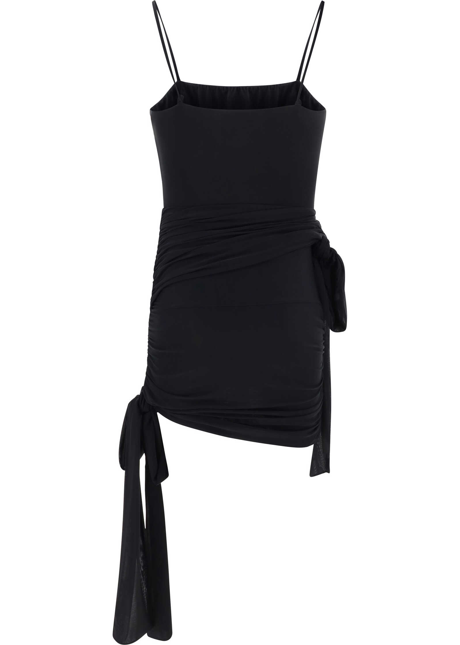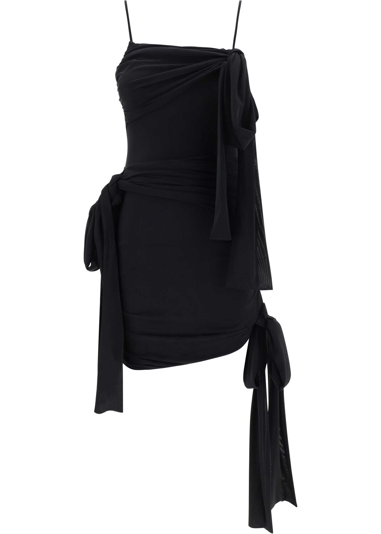 Dress by Blumarine, thin straps, draped bow detail around bust and waist, ruched effect ruffle details on side panels, soft bow applique on side panel.