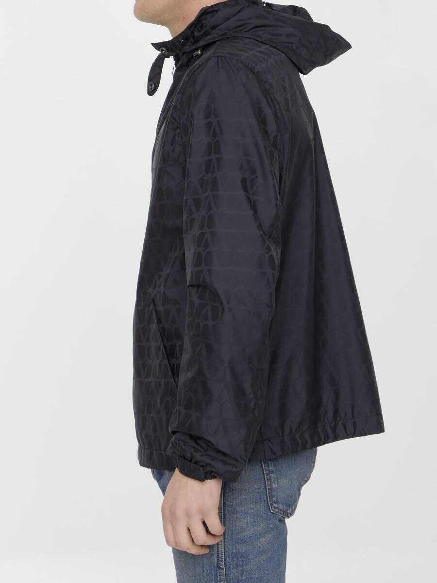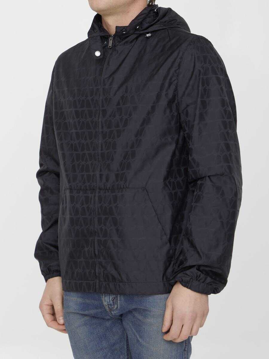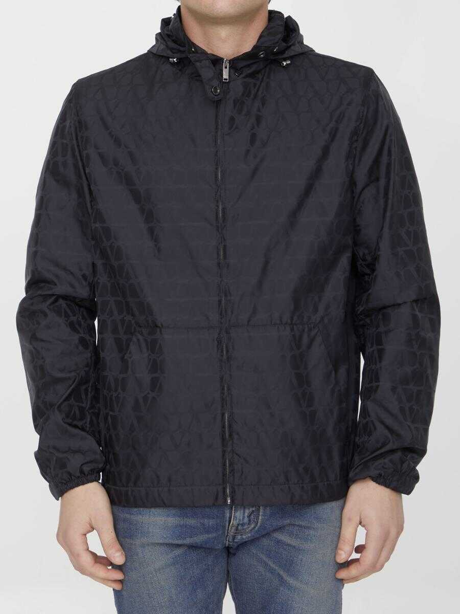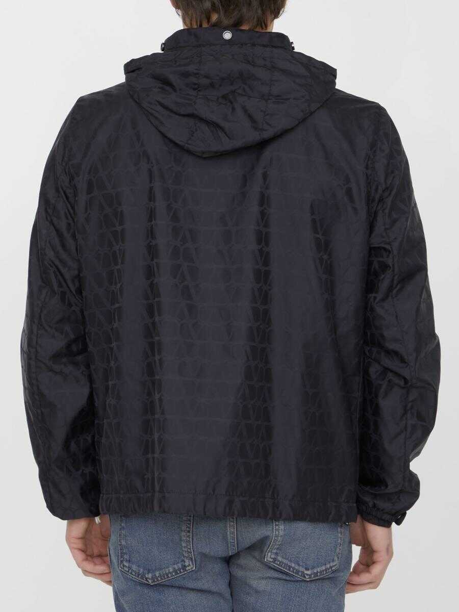 Valentino windbreaker in black nylon with all-over Toile Iconographe motif. It features drawstring hood, front zip closure, two side welt pockets, stretch cuffs and drawstring on hem. Mesh lining. Slim fit.