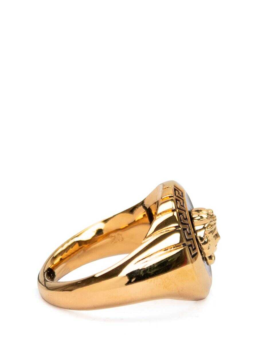 Gold-plated ring with central Medusa framed by Greca engravings and Versace signature.