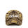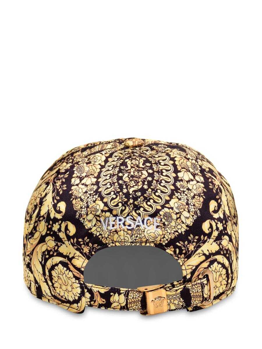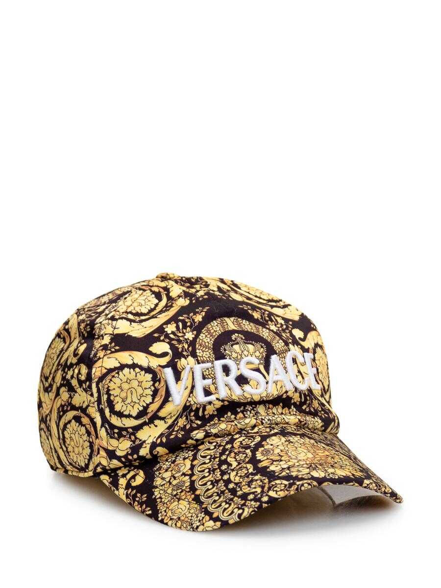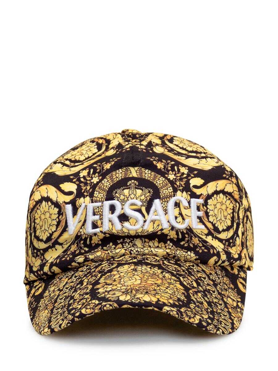 Black and yellow hat. Curved visor. Strap on back. Embroidered logo on front and back. All-over baroque print.
