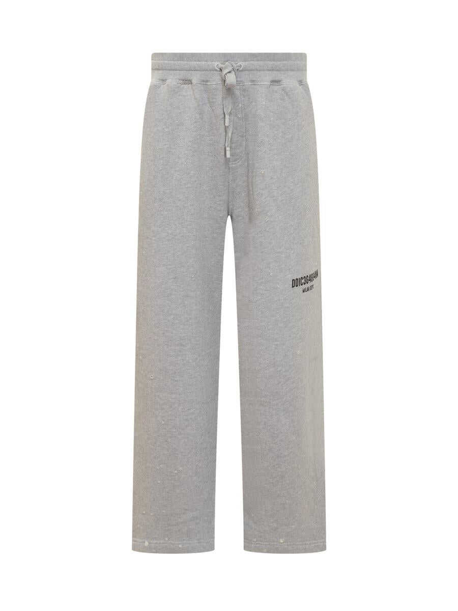 Gray long pants. Elastic and drawstring waistband. Printed logo on front. Side and back pockets.