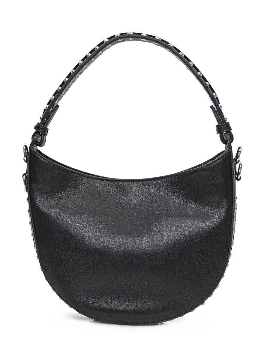 Black handbag. Removable shoulder strap. Studs at sides. Metal logo on front. Width: 26 Height: 20 Depth: 5