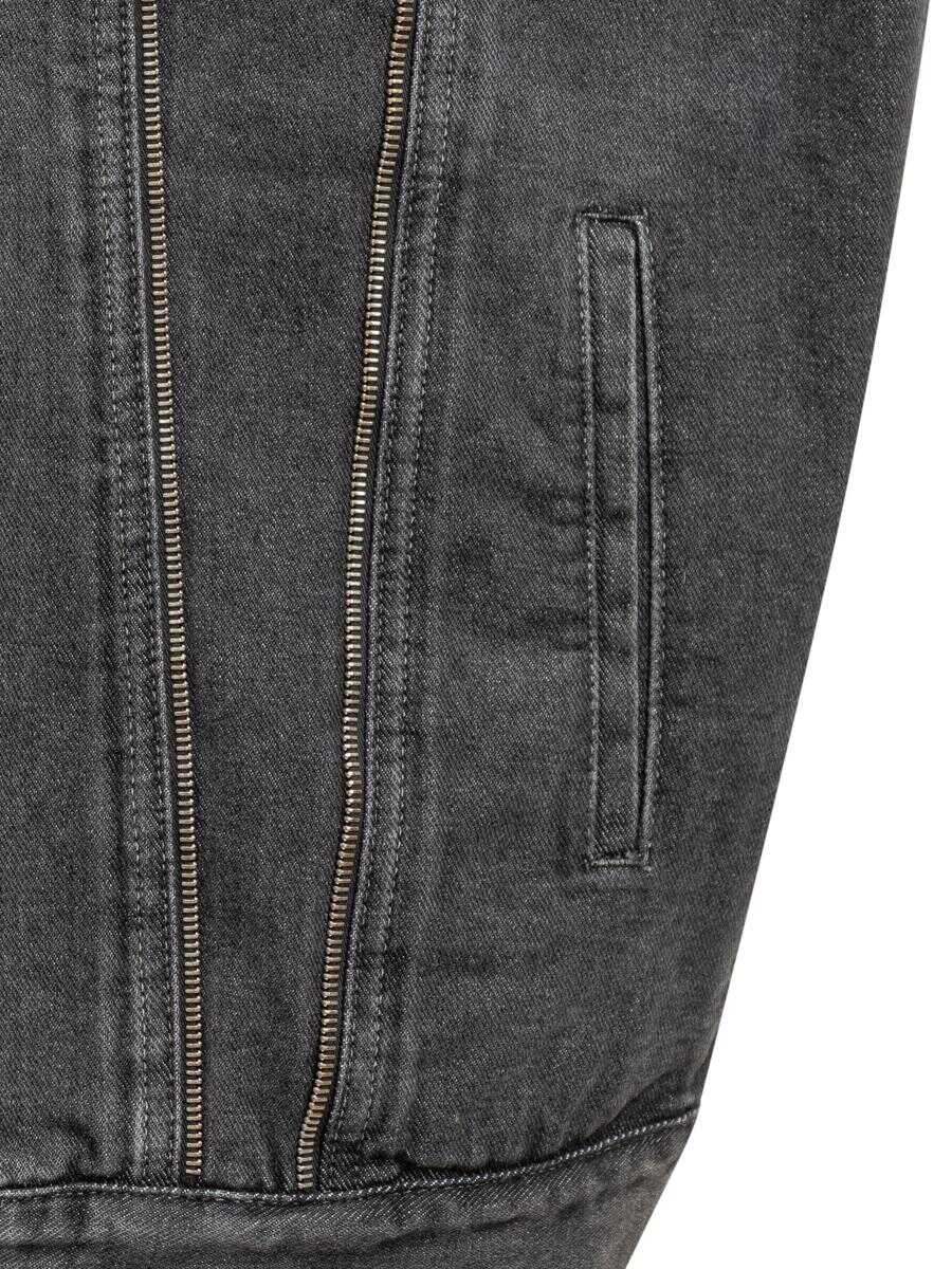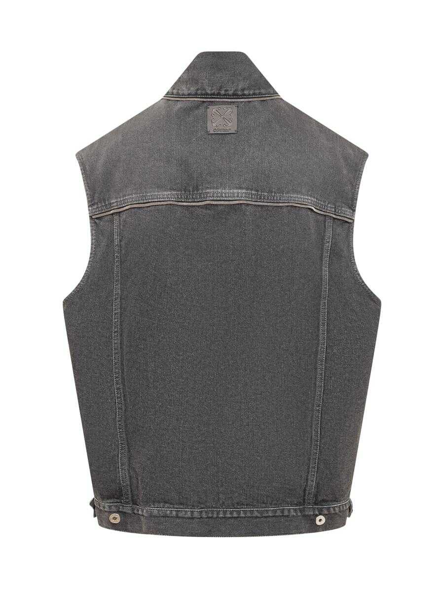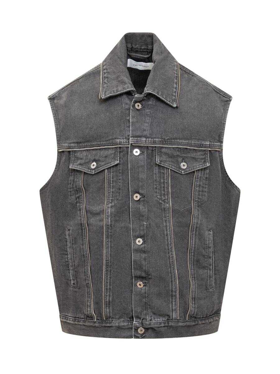 Sleeveless vest. Classic collar. Button closure. Four pockets on front. All-over applique zipper detail.