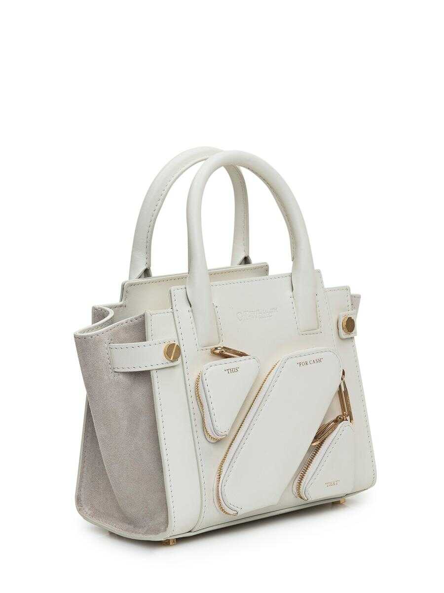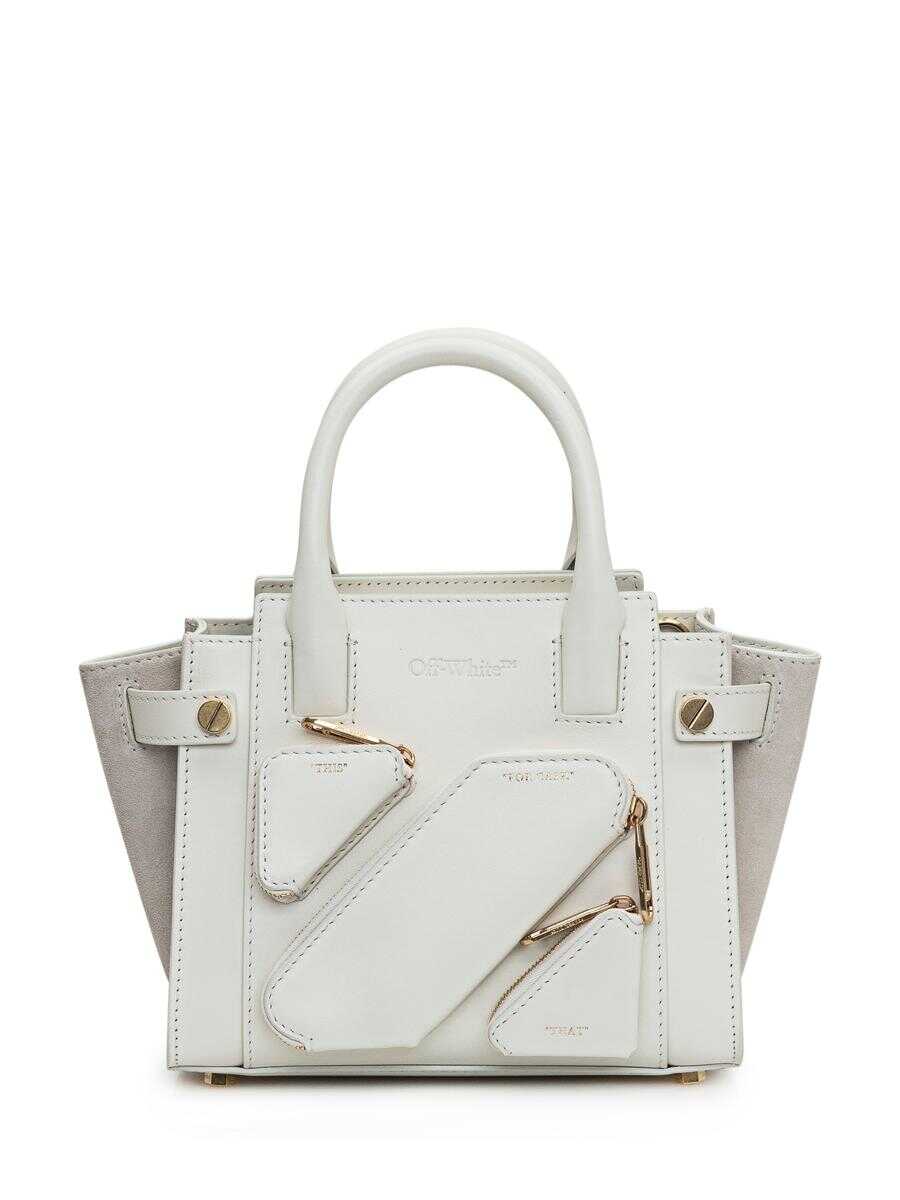 White shoulder bag. Two handles. Adjustable and removable shoulder strap. Button closure. Suede leather sides. Diagonal zippered pockets on front. Logo on front. Width: 22 Height: 18.5 Depth: 11