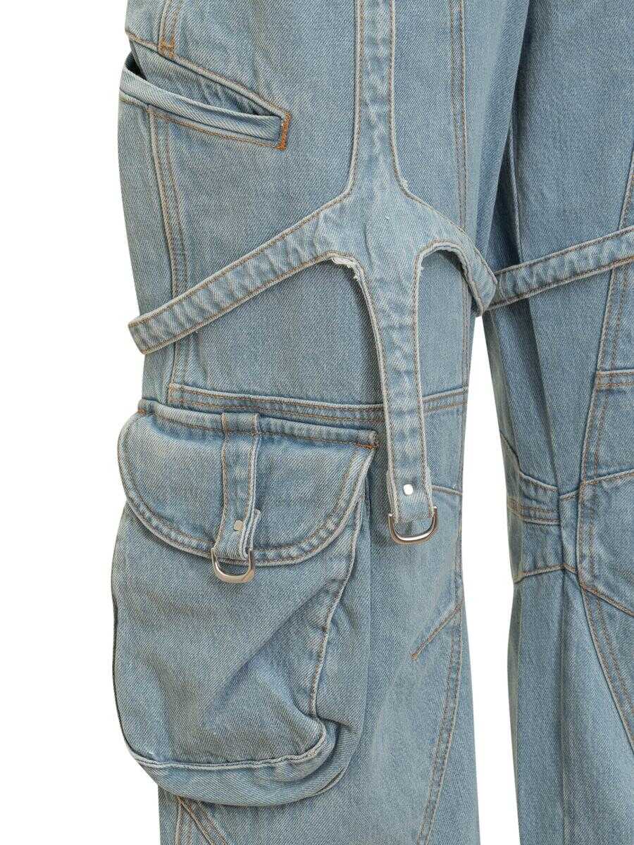 Long cargo jeans. Button closure. Eight pockets. All-over metal hook detail.