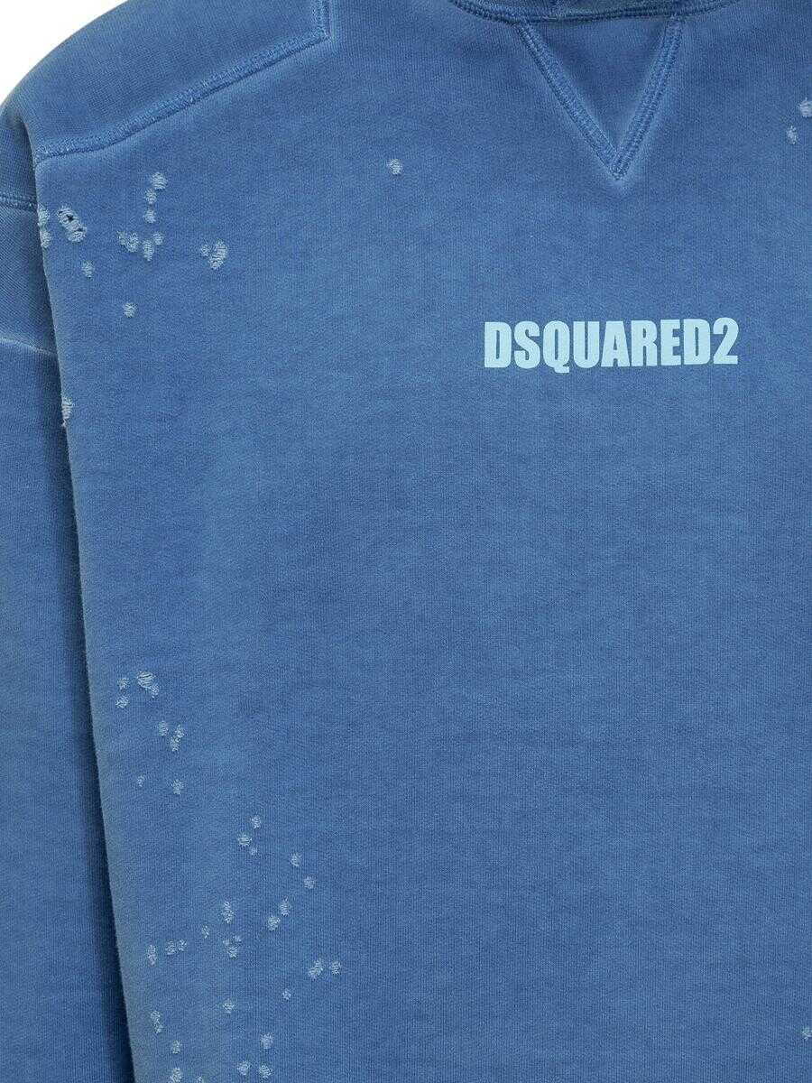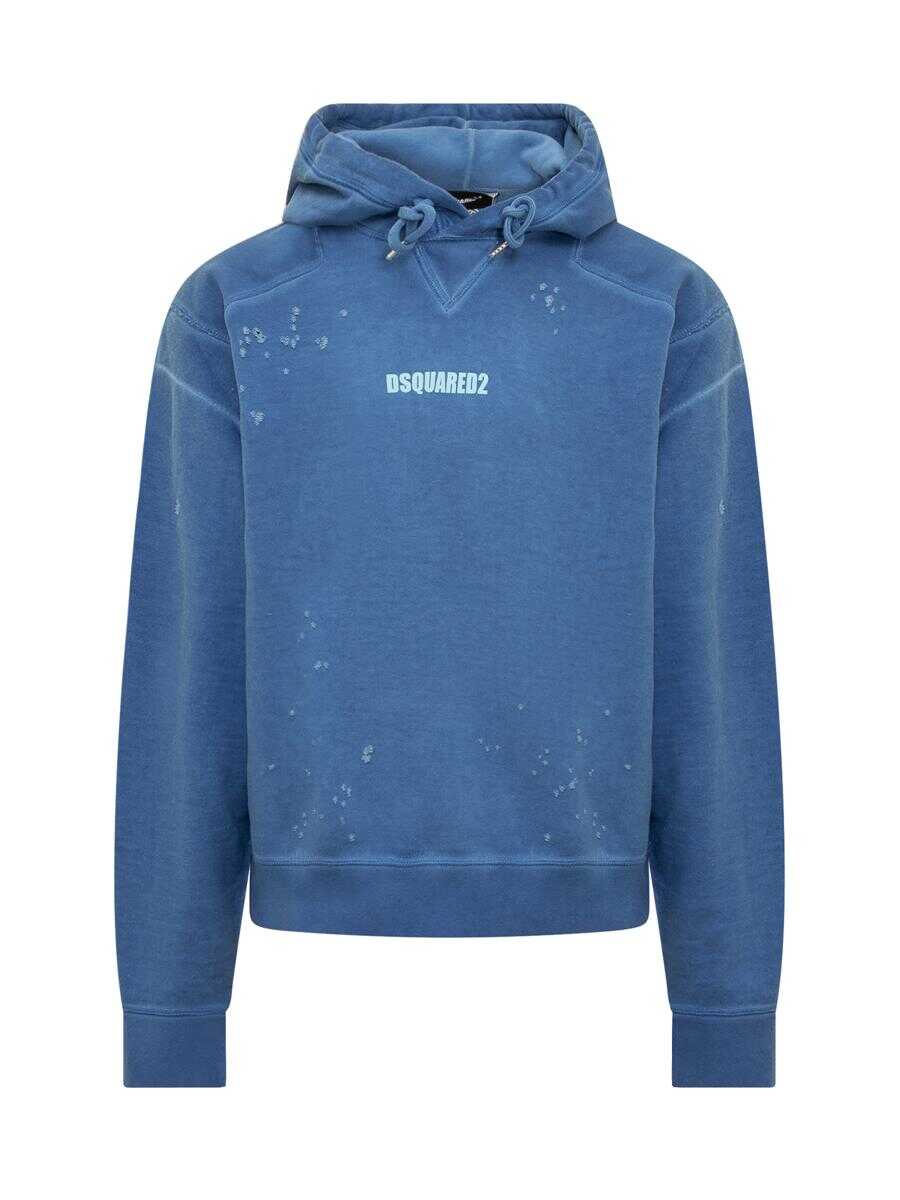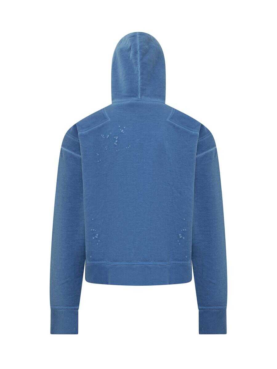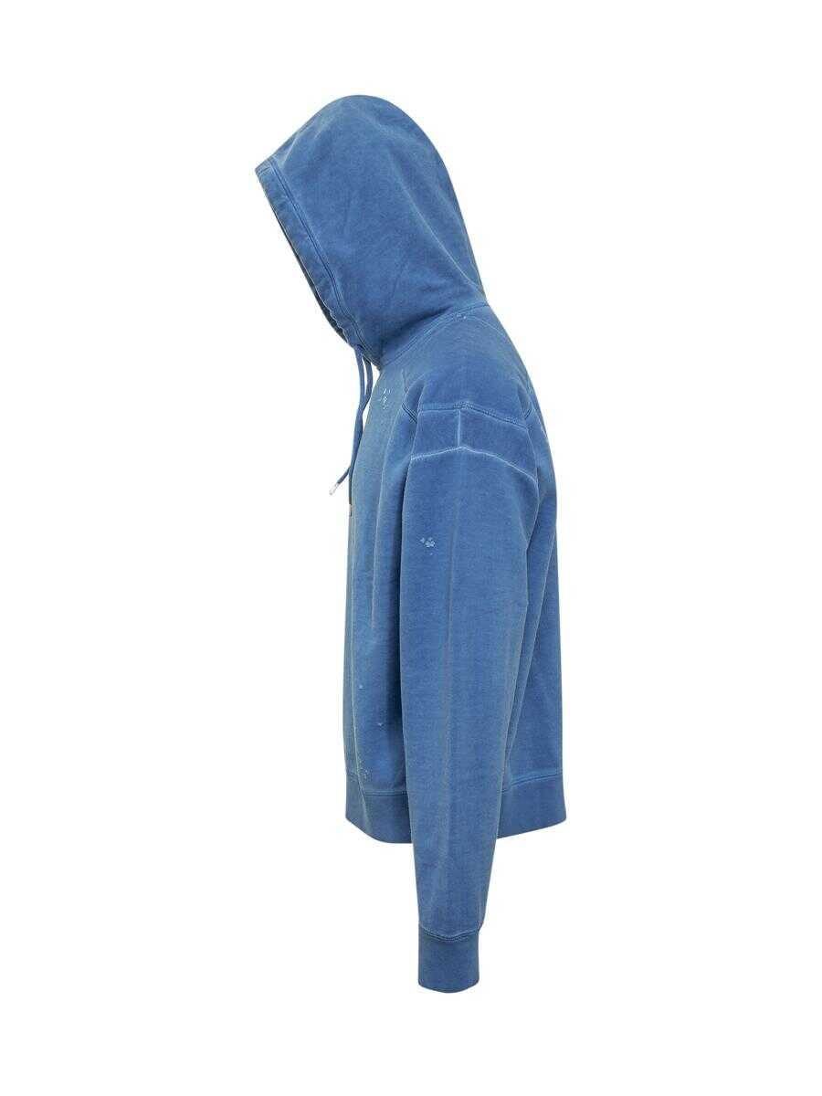 Blue long-sleeved sweatshirt. Drawstring hood. Logo on front. Ribbed cuffs and bottom. Worn effect.