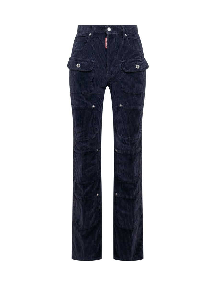 Blue long pants. Button closure. Multi-pockets. Belt loops. Logo on front.