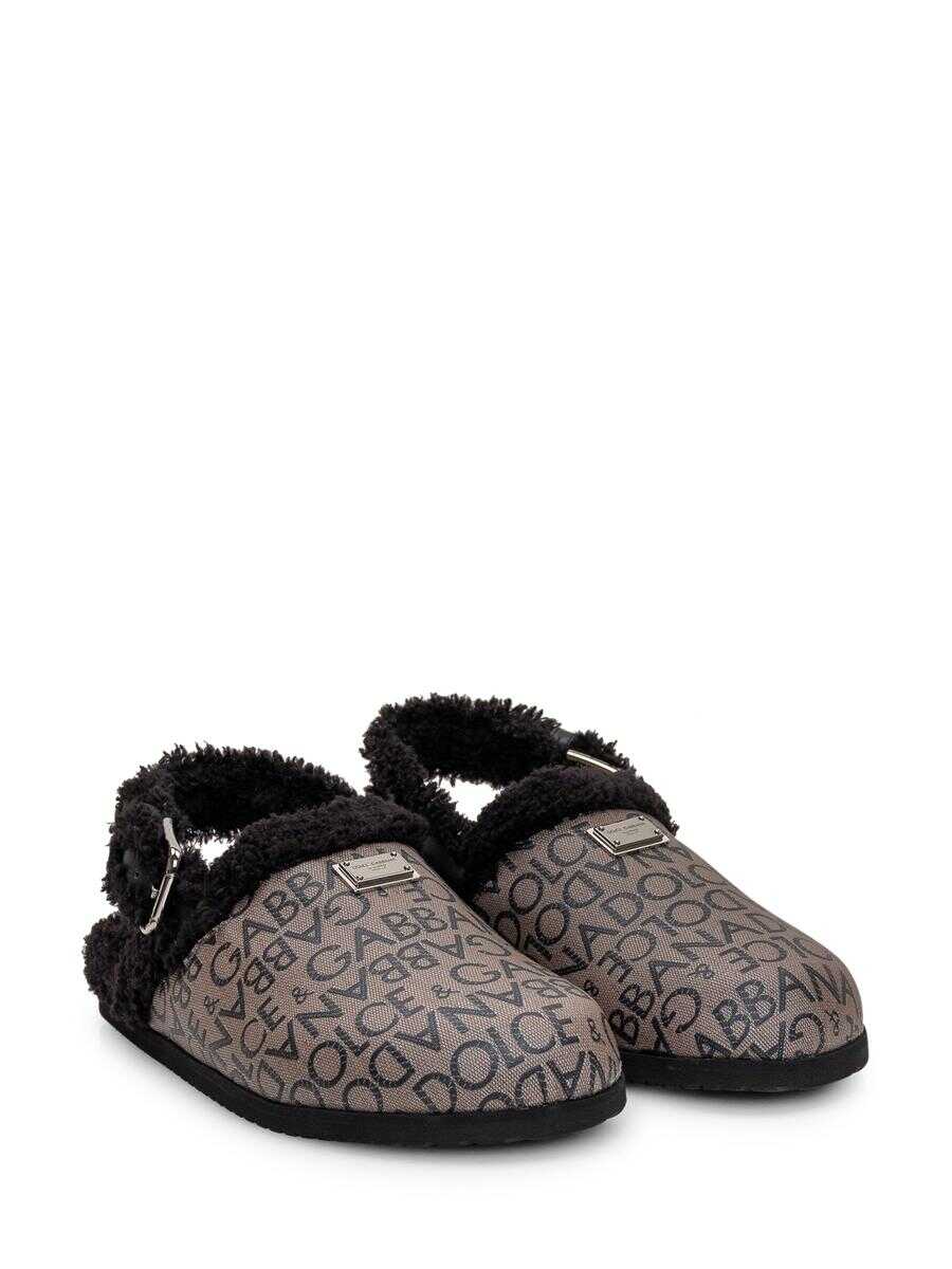 Slip-on sandal. Adjustable ankle strap. Faux fur lining. Round toe. All-over logo. Logo plaque on front.