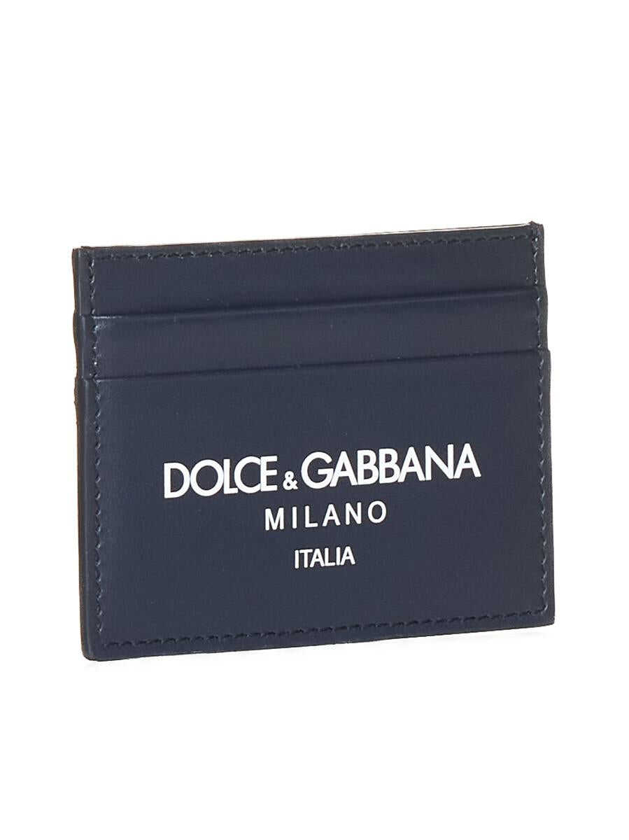 Dolce & Gabbana’s blue leather card holder featuring two compartments on each side, central flat pocket and white lettering logo printed on the front.