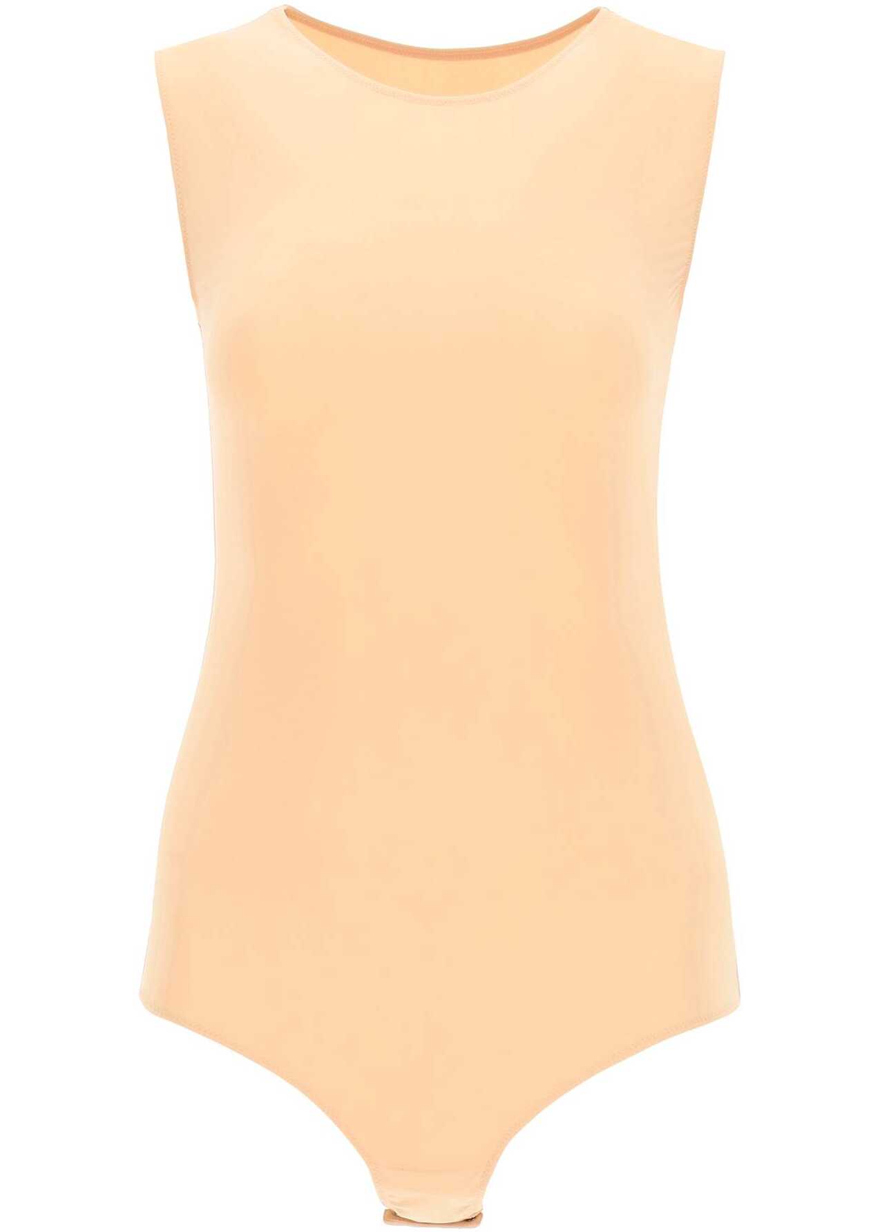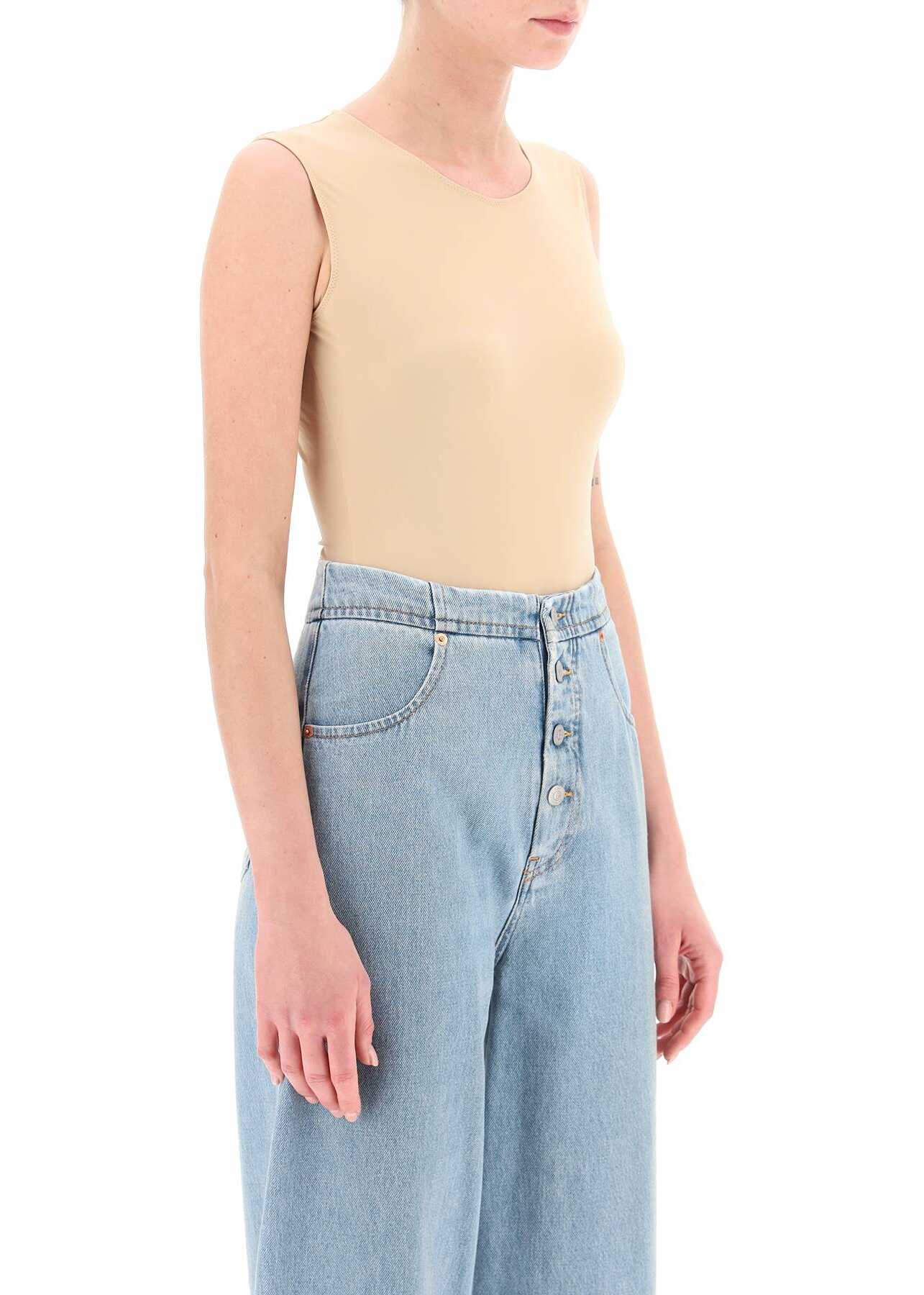 Second-skin lycra bodysuit by Maison Margiela, featuring a sleeveless design with crew neck and snap crotch closure. Signature Four Stitches on the upper back. The model is 177 cm tall and wears a size IT 38.
