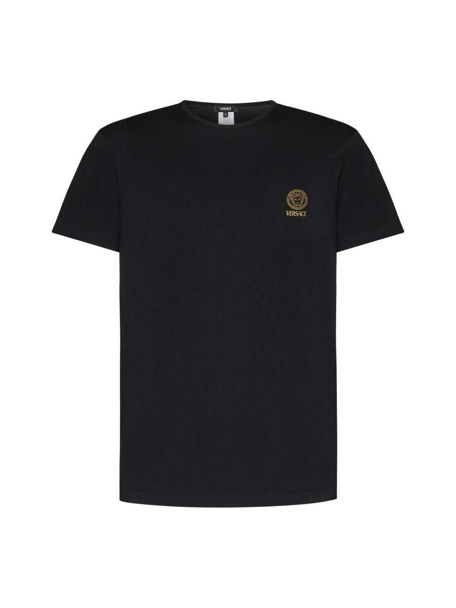 Set of 2 black cotton t-shirts from Versace featuring a crew neck and gold-tone printed Medusa logo on the chest.