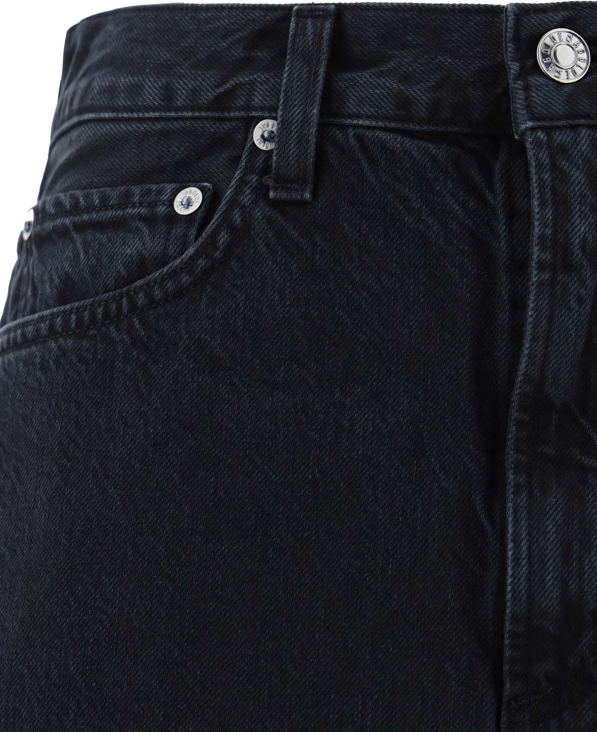Cotton Denim Skirt by Agolde, five-pocket design, front button and zipper closure, waistband loops, deep back slit, frayed hem, regular fit.