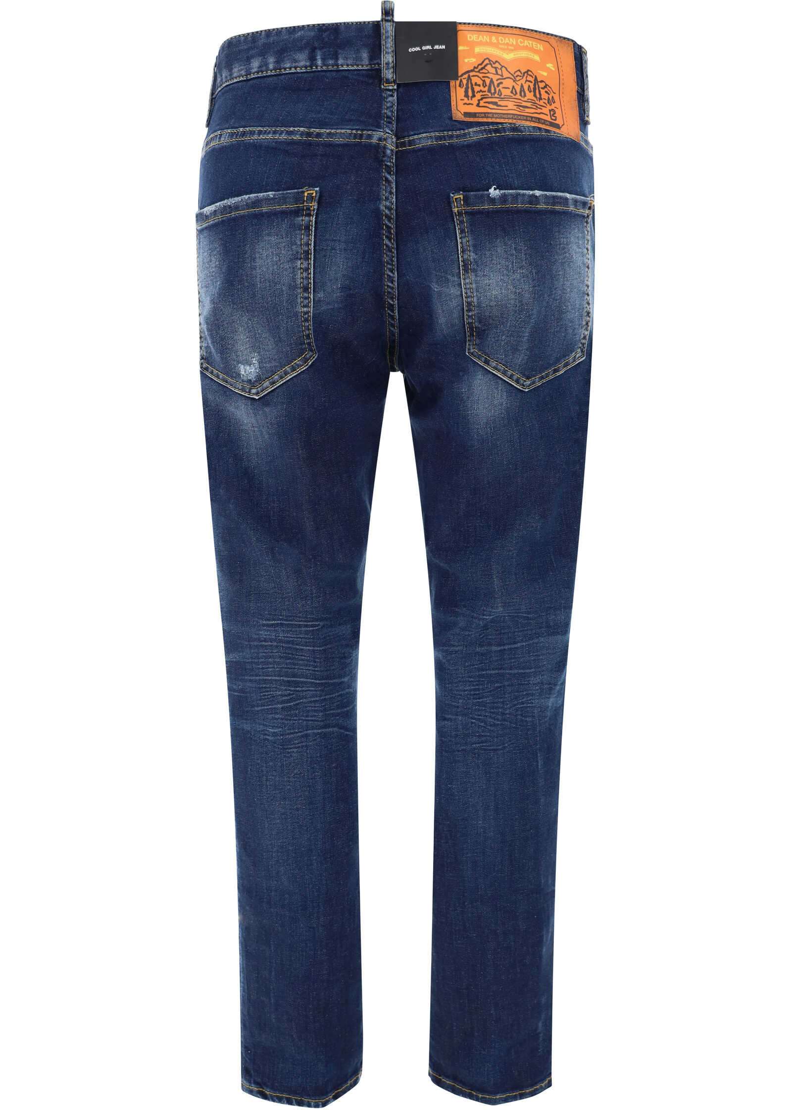Cotton Cool Girl Jeans by Dsquared2, featuring a five-pocket straight fit, a front button fastening, waistband loops, a vintage worn-effect design, and an iconic branded signature leather patch with pressure-printed applique on the back.
