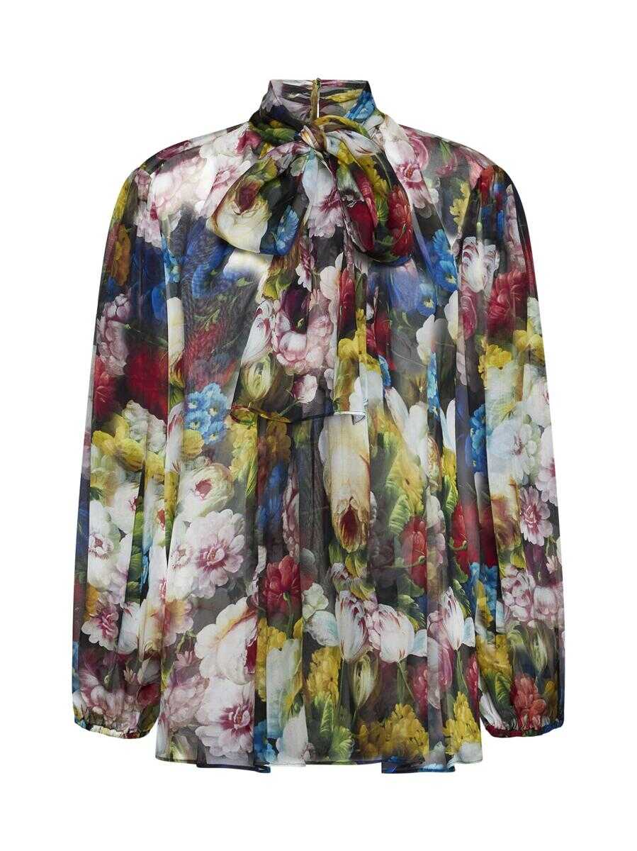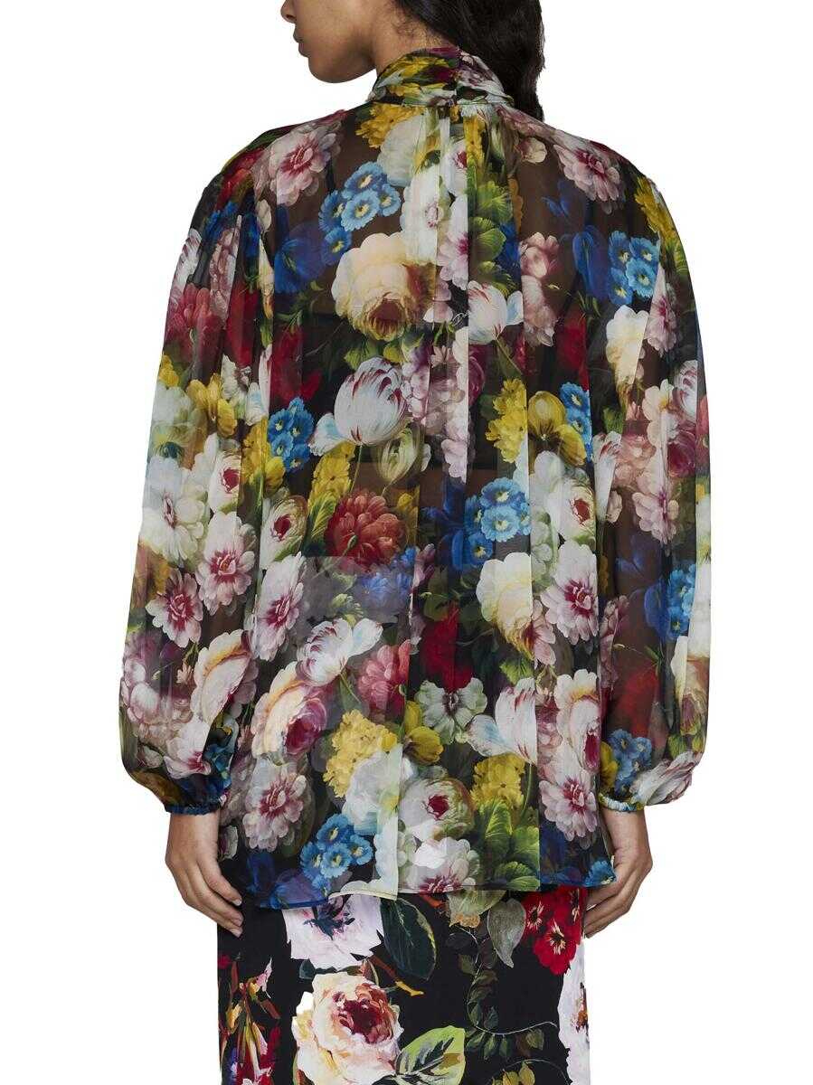 black/multicolour silk chiffon all-over floral print attached scarf long puff sleeves straight hem