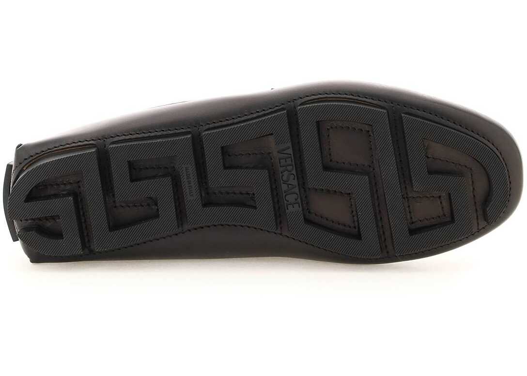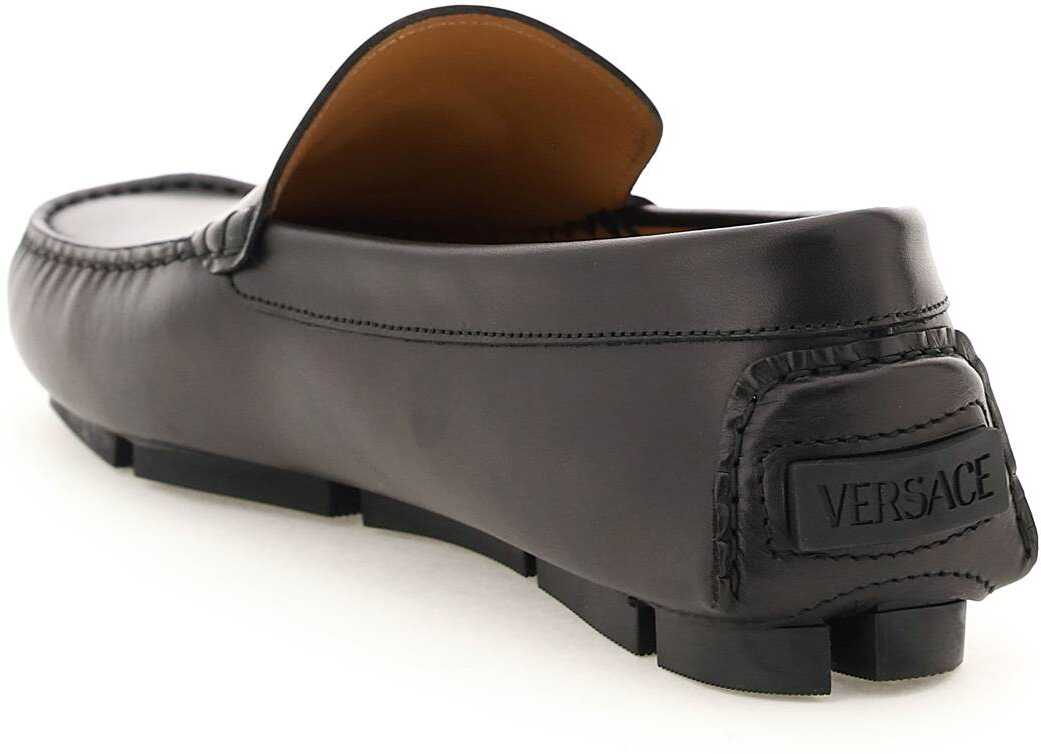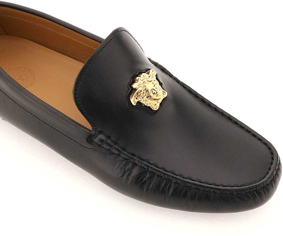 Versace "La Medusa" loafers in smooth leather, characterized by the iconic three-dimensional Medusa with Versace Gold finish. Rubber insert with engraved logo on the heel, leather lining with removable insole, Greek Chain-shaped rubber sole.