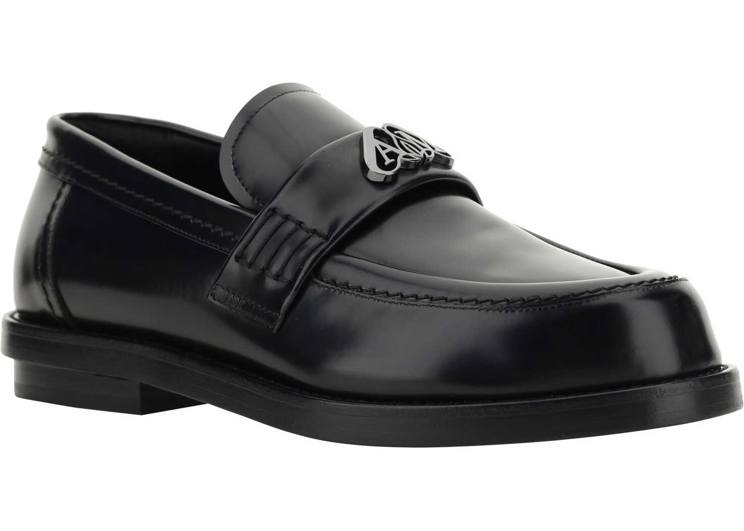 Calfskin Loafers by Alexander McQueen, slightly elongated round toe, leather block heel, front tray embellished with metallic branded logo detail, press-studded logo insole.