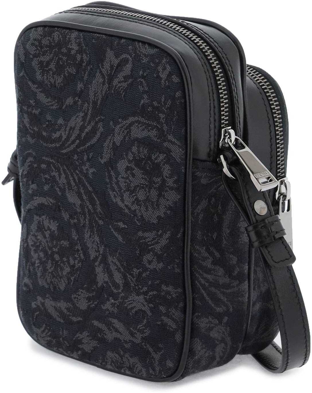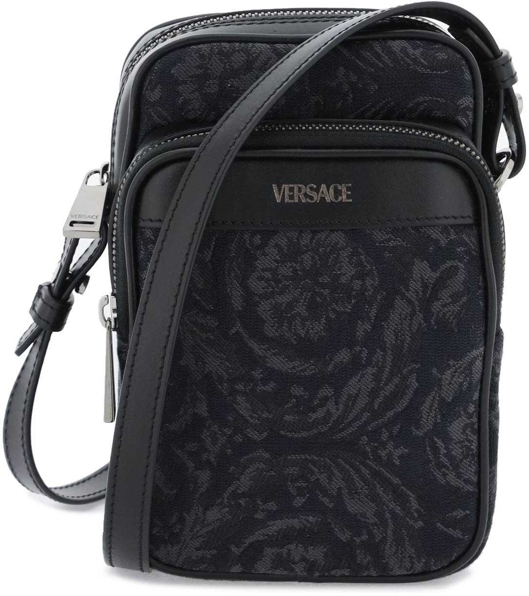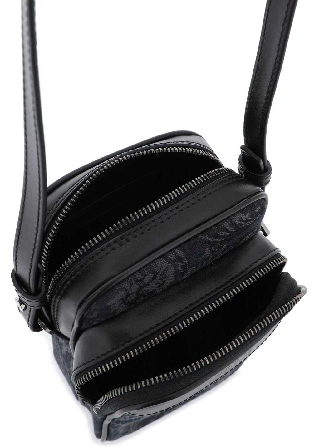 Versace shoulder bag made of canvas with jacquard Barocco print and leather details. Zipper closure, lined interior, additional front pocket and adjustable, detachable shoulder strap. Ruthenium-finished metalware.