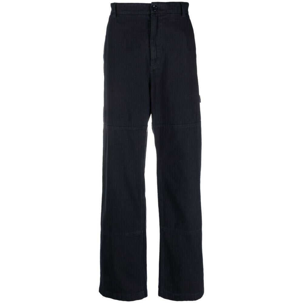 Midnight blue cotton tonal stitching seam detailing silver-tone logo plaque belt loops front button and zip fastening straight leg two side inset pockets two rear patch pockets straight hem