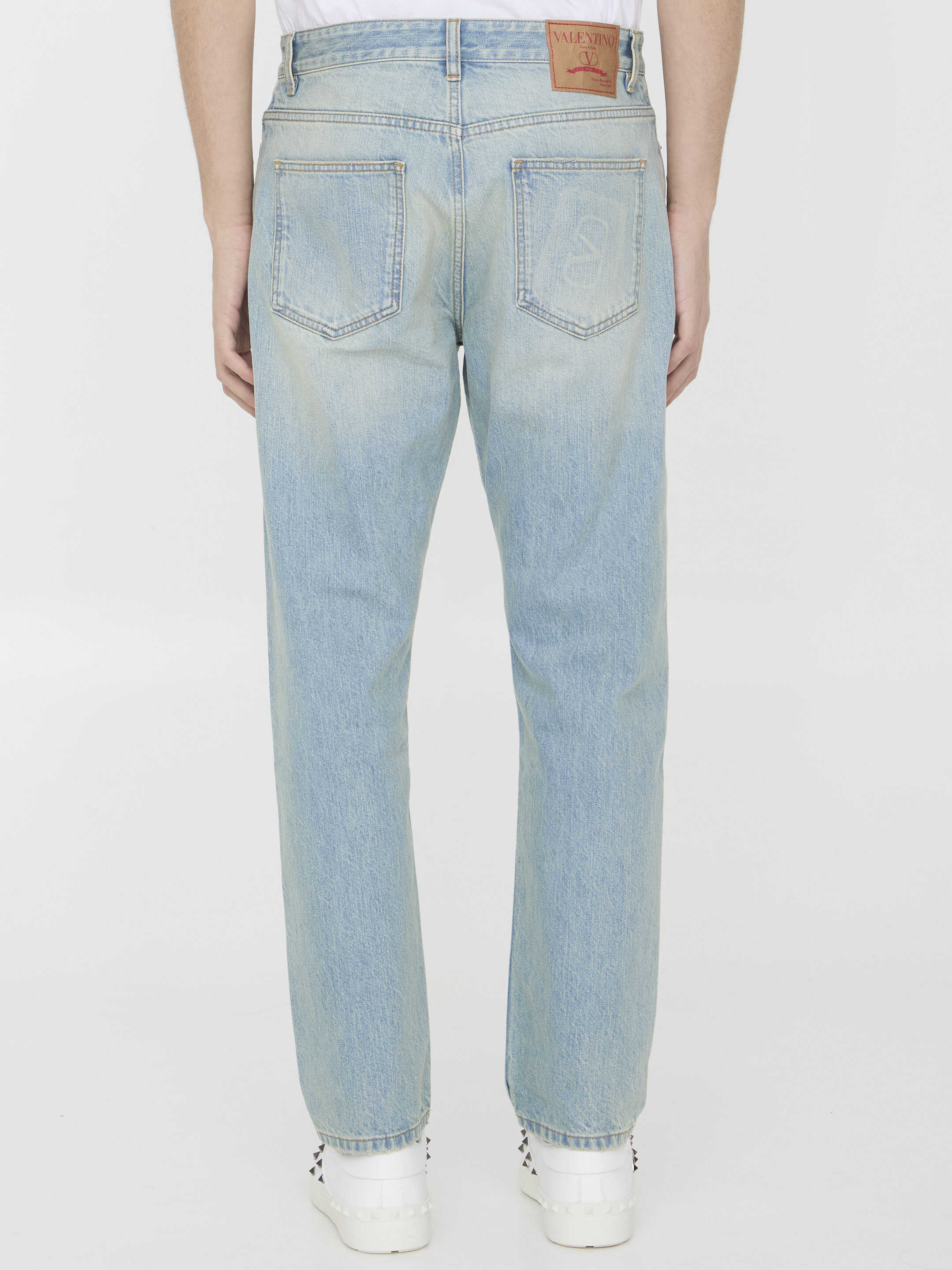 Valentino jeans in denim with embossed VLogo Signature at rear pocket. It features button closure, five-pocket design, VLogo Signature label in leather at the back and belt loops. Chino fit.